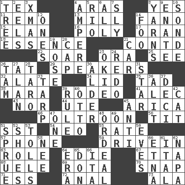 ACROSS 1. John Ritter's dad 4. Ancient river in northeast Turkey 8. It is so 11. San ____ (Riviera town) 13. Place where flour is made 14. Papal veil 15. Enthusiasm 16. More than one (prefix) 17. Northwest Algerian city 18. Gist 21. Continued (abbr.) 22. Fly high 23. Mouth or opening 25. Observe 26. Make lace 29. Orators 32. Having winglike extensions 34. Flaplike covering 35. Bit 38. Hindu Mythology: god of death 39. Cowboy competition 41. Actor Baldwin 43. Not either 44. Shoshoni 45. N. Chile seaport 46. Characterized by complete cowardliness 50. Teat (slang) 51. Fast jet (abbr.) 54. Modern: prefix 55. Pace 57. Give a jingle 59. Popular '50s hangout 63. Hero or heavy, e.g. 64. Singer Brickell 67. Singer James 68. Ubangi River tributary 69. Roll call or roster of names 70. Fastener 71. Curvy letter 72. Of or related to the anus 73. Insect wing DOWN 1. Relationship diagram 2. Snakelike fish 3. Dec. holiday 4. Electrical Unit 5. River (Sp.) 6. 100% 7. Roguish 8. Tall tales 9. Related on the mother's side 10. Message 12. Washington bills 14. Egg _ yung 19. Olfactory organ 20. Head covering 21. Auto 23. Migrant worker of the '30s 24. Do over again 26. Scottish cap 27. ____ Jay Lerner 28. Edible starchy tuberous root 30. Tree or shrub in the Birch family 31. Play the lead 33. Canvas cover 36. Set down 37. Tenth: prefix 39. Court order 40. Von Bismarck 42. Domesticated feline 45. Against 47. Single 48. Severe or trying experience 49. Boat paddle 51. Upset 52. Imelda's hoard 53. For Whom the Bell _____ 56. Nights before holidays 58. Born 60. Inactive volcano in Sicily 61. Slanted text style (abbr.) 62. California wine valley 64. Period 65. Spanish title 66. Call ___ day