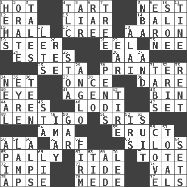ACROSS 1. Being at a high temperature 4. Small pie 8. Egg locale 12. Epoch 13. One who doesn't tell the truth 14. Indonesian resort city 15. Promenade 17. Algonquian 18. Composer Copland 19. Bull 21. Snakelike fish 23. Born 24. _____ Park, CO 26. Auto club (abbr.) 28. Bristle 30. Hard copy producer 34. Fish or hair follower 37. Single time 39. Have the gumption 40. Sight organ 41. Rep 43. Storage container 44. Ancient Greek god of war 46. Farming town in central California 47. Put into a specified state 48. Small, flat, pigmented spot on the skin 51. Indian titles of respect 54. Housemaid (var.) 55. Spew [out] 58. In the manner of 61. Sandy's bark 63. Grain storage towers 65. Chummy 67. Slanted text style (abbr.) 71. Lug 72. Body of Kaffir warriors 73. Travel on an animal 74. Large container 75. Domed church section 76. Ancient Persian 77. Raised railways DOWN 1. Cloth borders 2. Declaim 3. Falsehoods 4. Affectionate concern, for short 5. Wind 6. Actress Charlotte 7. Family _ (genealogy) 8. Basketball assoc. 9. Merit 10. A type of plum 11. Prong on a fork 16. Allows 18. Jai ____ 20. To sift 22. Hearing organ 25. Portico 27. Plus 29. White American of non-Hispanic descent 30. Hangs 31. Bar bills 32. One of the Great Lakes 33. Monthly bill 34. Actress Patricia 35. Jane of fiction 36. Adolescent 38. Corporate head (abbr.) 42. Hoop that covers a wheel 45. R.R. building 49. "If ____ say so..." 50. Slender fish 52. Big collection agency 53. Set of matching outer garments 56. Garlic unit 57. Add up to 58. Capital of Western Samoa 59. Desk light 60. High mountains 62. Unshakable 64. Arranges properly for use 66. Whopper 68. Standoff 69. Increase 70. Area sheltered from the wind