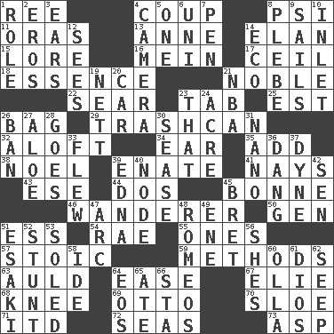 ACROSS 1. To separate or throw off 4. Overturn; upset 8. Air pressure measure (abbr.) 11. Mouths or openings 13. Singer Murray 14. Liveliness 15. Old wives' tales, e.g. 16. Chow _ 17. To provide with a ceiling 18. Center 21. Impressive in appearance 22. Burn superficially 23. Keyboard key 25. Eastern Standard Time (abbr.) 26. Container for groceries 29. File 13 32. Upward 34. Hearing organ 35. Find the sum of 38. Christmas carol 39. Maternal 41. Negative votes 43. Compass dir. 44. Two (Sp.) 45. Child's nurse 46. Roamer 50. Commissioned military rank (abbr.) 51. Curvy letter 54. Actress Charlotte 55. Singles 57. Unemotional 59. Modes 63. Old (Scot.) 64. Comfort 67. Writer Wiesel 68. Leg joint 69. Von Bismarck 70. A type of plum 71. It would 72. Oceans 73. Viper DOWN 1. Hero or heavy, e.g. 2. Greek god of love 3. Hearing organs 4. Device for capturing images 5. Single 6. Single; one (prefix) 7. Writing instrument 8. Cadet 9. Travel by water 10. An arm off of a larger body of water 12. Perceives with the eye 14. Environmental prefix 19. Remaining after all deductions 20. 4-wheeled motor vehicle 21. Basketball assoc. 23. Not this but _ 24. 43,560 square feet 26. Forbid 27. Medicinal plant 28. Leaves 30. Gospel singer Marvin 31. Billionth: prefix 33. Soared 36. Mild oath, euphamism for damn 37. Centimeter-gram-second unit of force 39. Pulitzer Prize-winning author Ferber 40. Thickened enlargement 42. Elected rep. 45. Cy Young winner Saberhagen 47. Curve 48. Lover boys 49. Compass dir. 51. 1973 Nobel Price Winner (Physics) Leo 52. Difficult or unusual or dangerous feat 53. Having a sole or soles 56. "______ My Girl" (Turtles hit) 58. Binary compound 60. Water jar 61. "Vaya con ____" 62. Ooze 64. Greek goddess of the dawn 65. Had dinner 66. R.R. building