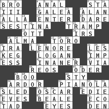 ACROSS 1. Sis' sibling 4. Of or related to the anus 8. R.R. building 11. One more than two 12. An organ shaped like a helmet 14. ____ Jay Lerner 15. Silent film actress Nazimova 17. Keyboard key 18. Have the gumption 19. French poetic form 21. _____ steamer (cargo ship) 23. Baseball player Mel 24. Big collection agency 25. _ mater 27. "Corrida" creature 30. Lyricist Gershwin 31. Poe poem 34. French article 37. Cask 38. Utah city north of Ogden 39. Naughty child 40. Double-curved letter 41. More empty; more void 43. By way of 44. Vintage cars 45. River in Europe 47. Sometimes accompanies a hiss 49. Filthy place 50. Zeal 52. Player piano 56. Downhill vehicle 57. Witty Wilde 60. Singer Brickell 61. Nights before holidays 62. Memphis, Tenn. Street 63. Environmental prefix 64. Small boy 65. Sight organs 66. Lair DOWN 1. Prejudice 2. Cause heat under the collar 3. Lubricates 4. Rep 5. Nanny 6. The first octave above the treble staff 7. Area sheltered from the wind 8. Criticizes harshly 9. Canvas cover 10. One (Scot) 13. Tate display 14. The sixth month of the Jewish calendar 16. Tiny particle 20. Slanted text style (abbr.) 22. River (Sp.) 25. Ancient Greek god of war 26. Fails to keep up a pace 27. Ancient Roman robes 28. NW Algerian seaport 29. French philosopher Descartes 30. Mamie's mate 32. Writer Wiesel 33. Words to Nanette 34. Moving, as bait 35. Independent ruler or chieftain 36. Health resort 42. Roll call or roster of names 44. Friend of Pooh 46. Unit of force 47. A special lineage 48. Probability 49. Male parents of animals 50. Inventor's middle name 51. Director Reiner 52. Diluted with white 53. Wrote a lyric poem 54. Louse (plural) 55. A really long time 56. Put into a specified state 58. Observe 59. Island