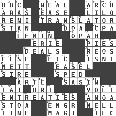 ACROSS 1. English channel? 4. Actress Patricia 8. Bowlike part 12. Ancient river in northeast Turkey 14. Comfort 15. _ and Stitch 16. Painter Guido (1575-1642) 17. Interpreter 20. Comedian Laurel of Laurel & Hardy 21. ___ good deed 22. Tax preparer (abbr.) 23. Soviet premier 1918-24 27. Brightly colored fish 29. One of the Great Lakes 31. Sliced desserts 34. Allots cards 35. Vintage cars 36. Otherwise 39. And so on (abbr.) 41. Is not 42. Remaining after all deductions 43. Artist's stand 46. The founder of a family 47. Moved rapidly 48. Johnson of "Laugh-In" 51. Indian antelope 54. Make lace 56. RI univ. 58. Electrical Unit 61. Pleas 66. Small Philippine buffalo 67. Portico 68. Engineer (abbr.) 69. 1994 drama film starring Jodie Foster 70. Prong on a fork 71. Wise men 72. Affectionate concern, for short DOWN 1. Taverns 2. Cy Young winner Saberhagen 3. Lessep's creation 4. Fish or hair follower 5. Hearing organ 6. White ___ sheet 7. Grant temporary use of 8. Insect wing 9. Actors Guy, Robert Welles, and Clint 10. Hoof sound 11. Israeli folk dance 13. Trig term 18. "Barney Miller" actor Jack 19. Pet locale 24. Born 25. Lyricist Gershwin 26. Mediterranean tributary 28. Showery time 30. _____ Park, CO 32. Age 33. Fast jet (abbr.) 34. Prevent from occurring 36. Followers of ems 37. Flowery wreath 38. Ski resort town in Vermont 40. Balmoral and tarboosh 44. Ocean 45. Begley and Asner 49. Third day of the wk. 50. Epoch 52. _ the terrible 53. Music written for nine 54. Trial 55. Opposed to 57. Detail 59. Hang loosely or laxly 60. Baby powder 62. Actress Charlotte 63. _ tizzy (2 wds.) 64. Ovum 65. _ Lanka