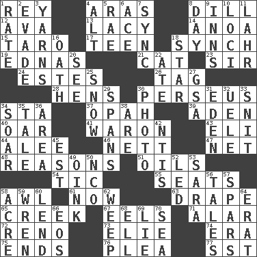 ACROSS 1. Marina Del _, California 4. Caspian sea tributary 8. Deli pickle 12. Actress Gardner 13. Made of lace 14. Small Philippine buffalo 15. Pacific island yam 17. Adolescent 18. Synchronize (abbr.) 19. Ferber et al. 21. Domesticated feline 23. Title for a knight 24. _____ Park, CO 26. Label 28. Coop moms 30. Son of Zeus who helped slay Medusa 34. R.R. building 37. Brightly colored fish 39. Arabian gulf 40. Rowing implement 41. Make _____ (do battle with) 43. Connecticut Ivy Leaguer 44. Toward shelter 46. Remaining after all deductions 47. Fish or hair follower 48. Thinks logically 51. Petroleums 54. Nervous spasm 55. Theater features 58. Leather borer 61. Immediately 63. Window treatment 65. Small stream 67. Snakelike fish 71. Having or resembling wings 72. Western Nevada city 73. Writer Wiesel 74. Epoch 75. Conclusions 76. Entreaty 77. Fast jet (abbr.) DOWN 1. Pace 2. Dodge 3. Tall tales 4. Keyboard modifier key 5. Actress Charlotte 6. Adept person 7. Synchronize (abbr.) 8. 24 hours 9. Lodging establishments 10. Event scenes 11. Cowardly lion portrayer 16. Pledge 18. Play the lead 20. Observe 22. Had dinner 25. Overwhelm 27. Girls' org. (abbr.) 29. Connects, as a bridge 30. Picture 31. Locale of original sin 32. Ubangi River tributary 33. In a ____ (agitated or irritated) 34. Fly high 35. Lie 36. Type of rug 38. "We ___ not amused" (Victoria) 42. Nuclear Threat Initiatives 45. Eastern Standard Time (abbr.) 49. Pig sound 50. Non-commissioned officer (abbr.) 52. Directed 53. "Two Mules for Sister ____" 56. Lies 57. Practice fights 58. 1/640 square mile 59. Songbird 60. Grant temporary use of 62. Shed a tear 64. Part of Q.E.F. 66. Greek goddess of the dawn 68. Pipe bend 69. Whopper 70. Ocean
