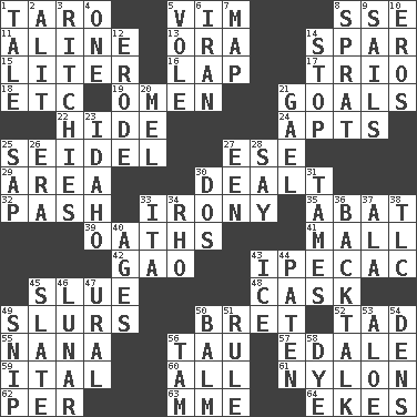 ACROSS 1. Pacific island yam 5. Zeal 8. Compass dir. 11. Place in a line 13. Mouth or opening 14. Practice fight 15. 61 cubic inches 16. Infant locale 17. Musical group of three 18. And so on (abbr.) 19. Sign of things to come 21. Finish lines 22. Flintstone garb 24. Flats, for short 25. A glass for beer 27. Compass dir. 29. Length times width 30. Started a card game 32. Romantic infatuation 33. Literary sarcasm 35. Blind as ____ 39. Profane or obscene expressions 41. Shopping center 42. E Mali city 43. Medicinal drug used to evoke vomiting 45. Turn sharply 48. Keg 49. Disparaging remarks 50. Cy Young winner Saberhagen 52. Small boy 55. Nanny 56. The 19th letter of the Greek alphabet 57. Peak District village in England 59. Slanted text style (abbr.) 60. 100% 61. Thermoplastic polyamide 62. For each 63. Madame (abbr.) 64. Makes supply last DOWN 1. Falsehood 2. Set down 3. Actors Guy, Robert Welles, and Clint 4. Single 5. Grand slam 6. SW Asia republic 7. Atlas unit 8. Small fatty European fish 9. Moves on water 10. Greek god of love 12. Wear away 14. Close up, plug up 20. Cartoonist voice _ Blanc 21. Highlander 23. Potato state 25. Plant excrement 26. Epoch 27. Car or cant ending 28. Declare 30. Two (Sp.) 31. Makes less strong or intense 33. Call ___ day 34. 17th letter of the Greek alphabet 36. Sass 37. In the manner of 38. Affectionate concern, for short 40. Grows older 43. Frozen water 44. Eucharist need 45. Schedule 46. Type of eclipse 47. Mountain range 49. Clip 50. Lip ointment 51. General guideline 53. Medicinal plant 54. Lairs 56. Scottish cap 58. Color