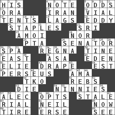 ACROSS 1. Part of HMS, perhaps 4. Short letter 8. Probability 12. Mouth or opening 13. SW Asia republic 14. Small bottle 15. Portable shelters 18. Fails to keep up a pace 19. Whirlpool 20. Paper fasteners 22. _ Lanka 23. Mine, in Marseilles 24. And not 25. Parent Teacher Assoc. 26. Elected representative 30. Health resort 33. Canadian anthropologist Darnell 36. Prong on a fork 37. Compass direction 39. White ___ sheet 40. Genesis locale 41. Writer Wiesel 42. Window treatment 44. Eastern Standard Time (abbr.) 45. Son of Zeus who helped slay Medusa 47. Nursemaid (var.) 50. Ring climax 51. Confederate soldiers (slang) 53. Pass on 54. Fools 57. Actor Baldwin 59. Elects 61. Lacking originality or spontaneity 63. Monetary unit of Yemen 64. Famous astronaut Armstrong 65. Immediately 66. Become fatigued 67. Celtic language 68. Observe DOWN 1. Being at a high temperature 2. Angers 3. Before Barbara or Clara 4. "Death on the ____" 5. Mouths or openings 6. Label 7. Followers of ems 8. Make much ado about nothing 9. "You Light Up My Life" star Conn 10. June honoree 11. Wily 16. Pack (down) 17. Specific locale 21. One who doesn't tell the truth 22. Boy, to dad 24. Teachers' org. 26. Fastener 27. Event that recurs at intervals 28. Washington bills 29. Monthly bill 30. Ooze 31. Diluted with white 32. SW Saudi Arabia district 34. Hearing organs 35. Girls' org. (abbr.) 38. A testis 42. Superhero pair 43. Merit 46. Make supply last 48. Not women's 49. "This won't hurt ____!" 52. Actors Connery and Penn 53. Letter starter 54. Nuclear Threat Initiatives 55. Small island 56. A type of plum 57. Nonscientific branch of learning 58. Cards in a Roman deck? 59. Single 60. For each 62. She-sheep