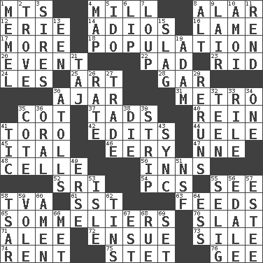 ACROSS 1. Mountains (abbr.) 4. Place where flour is made 8. Having or resembling wings 12. One of the Great Lakes 14. Goodbye (Sp.) 16. Unable to walk 17. Greater amount 18. Census information 20. Incident 22. Writing tablet 23. To free from 24. French article 25. Tate display 28. Slender fish 30. Partly open 31. Paris' subway 35. Small bed 37. Small amounts or degrees 40. It's straight from the horse's mouth 41. "Corrida" creature 42. Proofreads 44. Ubangi River tributary 45. Slanted text style (abbr.) 46. Suggestive of the supernatural 47. Compass dir. 48. Cell (Danish) 50. Taverns 52. Indian title of respect (Mr.) 54. Personal Computers (abbr.) 55. Observe 58. Federal power corp. 61. Fast jet (abbr.) 63. Gives food to 65. Wine waiters 70. Narrow board 71. Toward shelter 72. Follow as a consequence or result 73. Filth; sediment 74. Monthly bill 75. Proofreading order 76. Turn to the right DOWN 1. Klaipeda city 2. Collection of objects 3. Founders of families 4. Atlas unit 5. Wedding promise 6. Mouth edge 7. Central Nebraska county 8. Keyboard modifier key 9. Den 10. Mine, in Marseilles 11. Tear apart 13. Car or cant ending 15. Volcanic refuse 19. First of billions? 21. _ Mahal 26. Assign a rank or rating to 27. Buy and sell 29. Summer TV shows 30. Ringlike coral islands and reefs 32. Adolescent 33. Cause heat under the collar 34. Single 35. ____ d'Azur (French Riviera) 36. Relating to the mouth 38. Expire 39. Empty completely 41. Nervous spasm 43. Synchronize (abbr.) 49. Celtic language 51. Overdraft (abbr.) 53. Small island 55. Former Milwaukee Brewers owner Bud 56. Peak District village in England 57. First name in cosmetics 58. Russian ruler of old 59. Short-tailed, large-bodied rat 60. So be it 62. Airtight sealed metal containers 64. Double-curved letter 66. Was introduced to 67. Eastern Standard Time (abbr.) 68. Regret 69. Arrange properly for use
