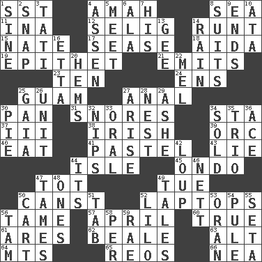 ACROSS 1. Fast jet (abbr.) 4. Nanny 8. Ocean 11. _ tizzy (2 wds.) 12. Former Milwaukee Brewers owner Bud 14. Undersized animal 15. Nathan's nickname 17. Gospel singer Marvin 18. Opera by Verdi 19. Curse 21. Gives off 23. "___ Little Indians" 24. Followers of ems 25. Island territory of the United States 27. Of or related to the anus 30. Baking dish 31. Sounds asleep 34. R.R. building 37. One more than two 38. From or relating to Ireland 39. The grampus (Milton) 40. Erode 41. Soft color 43. Whopper 44. Capri or Wright 45. Southwest Nigerian state 47. Small child 49. Third day of the wk. 50. 2nd pers. sing. pres. of can (arch.) 52. Portable computers 56. Not wild 57. Showery time 60. Loyal 61. Ancient Greek god of war 62. Calif. Air Force Base 63. The first octave above the treble staff 64. Mountains (abbr.) 65. Vintage cars 66. Teachers' org. DOWN 1. Trig term 2. Fastener 3. Jacques of French films 4. NE Netherlands city 5. Rendezvous 6. In the manner of 7. Part of HMS, perhaps 8. Costumes for special activities 9. Extremities 10. _ moment's notice (2 wds.) 13. Unit of force equal to gravity 14. Water falling in drops from the sky 16. Singer James 20. Cloth borders 22. Cartoonist voice _ Blanc 25. Greek goddess of the earth (variant) 26. A single undivided whole 27. Originate 28. Egg locale 29. American tennis player Robert 30. Sliced dessert 32. Pinches, bites 33. Relating to the mouth 34. Exchanged or delivered for money 35. Musical group of three 36. Adept person 42. Central Nebraska county 44. It is 46. Remaining after all deductions 47. Makes less strong or intense 48. Singles 49. Lies 50. Draw slowly or heavily 51. Keyboard key 52. _ and Stitch 53. NW Algerian seaport 54. Whimper 55. Bristle 56. Scottish cap 58. For each 59. Actress Charlotte