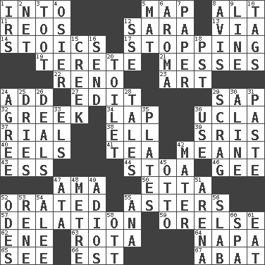 ACROSS 1. To the inside or interior of 5. Atlas unit 8. Keyboard modifier key 11. Vintage cars 12. "Two Mules for Sister ____" 13. By way of 14. Unemotional ones 17. Closing up, plugging up 19. Cigar-shaped 21. Makes clutter 22. Western Nevada city 23. Tate display 24. Find the sum of 27. Prepare for publication 29. Plant excrement 32. Of Greece 34. Pet locale 36. Southern CA. univ. 37. Monetary unit of Yemen 38. Pipe bend 39. Indian titles of respect 40. Snakelike fish 41. Beverage made from leaves 42. Intended 43. Curvy letter 44. Portico 46. Turn to the right 47. Housemaid (var.) 50. Singer James 52. Spoke pompously 55. Michaelmas daisies 57. Accusation by an informer 59. Threatening words 62. Compass dir. 63. Round or rotation of duties 64. California wine valley 65. Perceive with the eye 66. Eastern Standard Time (abbr.) 67. Blind as ____ DOWN 1. Big collection agency 2. Fish or hair follower 3. A blast of a horn 4. Flexible twig of a willow tree 5. Floor covering 6. Scent 7. Some stationery 8. Opinion 9. Actor's bit 10. Labels 12. Compass dir. 15. Small stream 16. Post 18. Pacific Standard Time (abbr.) 20. Rest room 24. Match 25. Frees from moisture 26. Allots cards 28. Stories 29. Lean end of the neck 30. Place in a line 31. Thick mixture 33. Raised railways 35. Food holders 36. Purpose 42. Mother 45. "Beetle Bailey" pooch 47. _ moment's notice (2 wds.) 48. Distance measurement (Brit.) 49. Goodbye (Sp.) 51. Sports stadium 52. Lyric poems 53. French philosopher Descartes 54. Toward shelter 55. Santa ___, CA 56. Thick slice 58. Baseball player Mel 60. Health resort 61. Consume