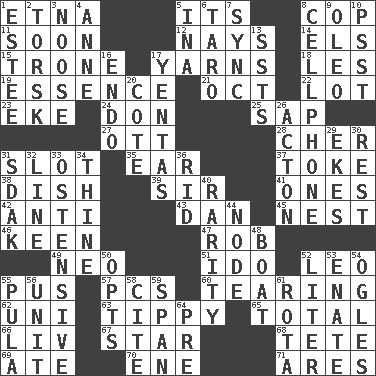 ACROSS 1. Inactive volcano in Sicily 5. It is 8. Police officer (slang) 11. Within a short period 12. Negative votes 14. Raised railways 15. Marketplace scale 17. Tall tales 18. French article 19. Core 21. Sep. follower 22. Car dealer's back yard 23. Supplement with great effort 24. Spanish title 25. Plant excrement 27. Baseball player Mel 28. "Mermaids" star 31. Groove 35. Hearing organ 37. Puff or smoke 38. Food container 39. Title for a knight 41. Washington bills 42. Opposed to 43. Daniel's nick name 45. A home for chicks 46. Peachy ____! 47. Director Reiner 49. Modern: prefix 51. Wedding promise 52. Lion 55. Festering 57. Personal Computers (abbr.) 60. Separating forcefully 62. Corn or form start 63. Likely to tip or tilt 65. Add up to 66. 54 in ancient Rome 67. Play the lead 68. False hair 69. Had dinner 70. Compass dir. 71. Ancient Greek god of war DOWN 1. First name in cosmetics 2. Cod relative 3. Trap for birds or small mammals 4. Singer Murray 5. _ tizzy (2 wds.) 6. Edible starchy tuberous root 7. Synchronize (abbr.) 8. Portable communications device 9. Butter sub 10. Inconspicuous attention getter 13. Fast planes 16. Inside; within (prefix) 17. Gossips 20. ____ d'Azur (French Riviera) 26. 13-14th century defensive garment 29. Makes supply last 30. Repose 31. Neighbor of Neb. 32. Actor's bit 33. Clearly or manifestly demonstrative 34. One or ones belonging to thee 36. To free from 40. Noteworthy scarcity 44. Connecting point 48. Water vessel 50. Elects 52. 61 cubic inches 53. Maternal 54. Stares 55. Monetary unit of Botswana 56. A single undivided whole 58. Quote 59. Connect, as a bridge 61. Round or rotation of duties 64. Before (prefix)