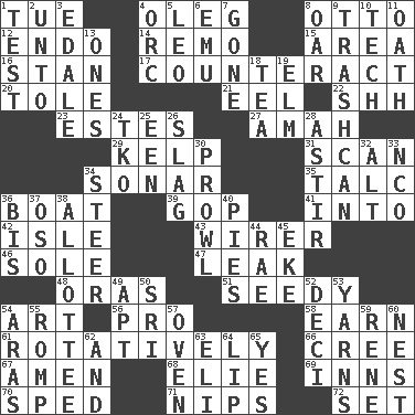 ACROSS 1. Third day of the wk. 4. Cassini of fashion 8. "Beetle Bailey" pooch 12. Inside; within (prefix) 14. San ____ (Riviera town) 15. Type of rug 16. Comedian Laurel of Laurel & Hardy 17. Neutralize 20. Lacquered or enameled metalware 21. Snakelike fish 22. Quiet! 23. _____ Park, CO 27. Nanny 29. Seaweed 31. Skim 34. Echolocation 35. Baby powder 36. Water vessel 39. Republican Party 41. To the inside or interior of 42. Small island 43. One who wires 46. Not divided or shared with others 47. Path through which fluid escapes 48. Mouths or openings 51. Full of seeds 54. Tate display 56. Adept person 58. Merit 61. Happening in regular succession 66. Algonquian 67. So be it 68. Writer Wiesel 69. Restaurants 70. Broke a traffic law 71. Pinches, bites 72. Arrange properly for use DOWN 1. Trial 2. To (old English) 3. Peak District village in England 4. The grampus (Milton) 5. Lion 6. Australian flightless bird 7. Went 8. Rowing implement 9. File 13 10. Technical work 11. Pledge 13. Singles 18. Beverage made from leaves 19. Shade tree 24. Ring climax 25. Car or cant ending 26. Volcanic refuse 28. Having gotten out of bed 30. Move like a hungry wolf 32. Keyboard modifier key 33. Non-commissioned officer (abbr.) 34. Navigate 36. Again 37. Bear (Spanish) 38. One to whom something is allotted 40. Sliced desserts 44. Actress Charlotte 45. Make supply last 49. Fitting 50. _ Lanka 52. Tenth: prefix 53. Tall tales 54. Caspian sea tributary 55. Play 57. Baking chamber 59. French philosopher Descartes 60. Egg locale 62. Also 63. Biblical high priest 64. Mouth edge 65. Consenting reply