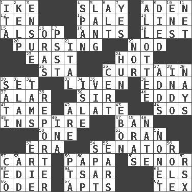 ACROSS 1. Mamie's husband 4. Kill 8. An important port of Yemen 12. Nine, plus one 13. Light colored 14. Actor's bit 15. Columnist Joseph or Stewart 18. Pismires 19. For fear that 20. Puckering 22. Allow head to fall sleepily 23. 90 degrees 24. Being at a high temperature 25. R.R. building 26. Window treatment 30. Arrange properly for use 33. Make or become more lively 36. Pulitzer Prize-winning author Ferber 37. Having or resembling wings 39. Title for a knight 40. Whirlpool 41. Not wild 42. Having winglike extensions 44. Mayday 45. Stimulate to action 47. Prohibit 50. Single 51. NW Algerian seaport 53. Period 54. Elected representative 57. Draw slowly or heavily 59. Dad 61. Sir (Sp.) 63. Singer Brickell 64. Russian ruler of old 65. Raised railways 66. River in Europe 67. Tenement units (abbr.) 68. John Ritter's dad DOWN 1. Call ___ day 2. Seaweed 3. Follow as a consequence or result 4. Connect, as a bridge 5. Long (Scottish) 6. The first octave above the treble staff 7. It is so 8. One to whom something is allotted 9. Passed on 10. Followers of ems 11. Fish or hair follower 16. Mouths or openings 17. Inconspicuous attention getter 21. Slanted text style (abbr.) 22. And not 24. Attila the _ 26. An absolute certainty 27. Sums up 28. _ china 29. Negative votes 30. Suttee (variant) 31. Flair 32. Scottish caps 34. Capri or Wright 35. By way of 38. Newsperson 42. "We ___ not amused" (Victoria) 43. Inky black, to poets 46. _ tizzy (2 wds.) 48. Caspian sea tributary 49. Nathan's nickname 52. Music written for nine 53. 4th largest of the Great Lakes 54. Argument over a trivial matter 55. Hearing organs 56. Hero or heavy, e.g. 57. Corporate head (abbr.) 58. Find the sum of 59. Parent Teacher Association (abbr.) 60. Cleo's killer 62. Acura sports coupe