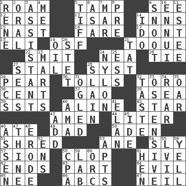 ACROSS 1. Wander aimlessly 5. Pack (down) 9. Perceive with the eye 12. Celtic language 13. Austrian river, tributary to the Danube 14. Lodging establishments 15. Political cartoonist Thomas 16. Conductor's collection 17. Do not 18. Biblical high priest 19. Order of Saint Francis (abbr.) 21. Woman's close-fitting hat 22. Stricken, poetically 24. Teachers' org. 26. Standoff 27. Showing deterioration from age 28. System (abbr.) 29. Lightbulb-shaped fruit 30. For Whom the Bell _____ 32. "Corrida" creature 36. Penny 37. E Mali city 38. Toward the sea 39. Fast planes 40. Place in a line 42. Play the lead 43. So be it 44. 61 cubic inches 46. Had dinner 49. Male parent 50. Arabian gulf 51. Tear up 53. A saturated hydrocarbon 54. Stealthy 57. The Jewish people; Israel 58. Hoof sound 61. Hub of activity 62. Conclusions 63. Component 64. Morally bad or wrong 65. Born 66. Lettered men learn these first 67. Famous astronaut Armstrong DOWN 1. French philosopher Descartes 2. Taken by mouth 3. Helper 4. Was introduced to 5. Small quarrel 6. White ___ sheet 7. Third mo. 8. Before (prefix) 9. Snout, nose 10. World-weariness 11. First name in cosmetics 14. Wedding promise 19. Petroleum 20. Proofreading order 21. Make lace 23. Shops 24. Thermoplastic polyamide 25. Double-curved letter 27. Observes 28. Killed 29. Personal Computers (abbr.) 31. Stared 32. Clothes sense 33. Clearly or manifestly demonstrative 34. Posterior 35. Rowing implement 40. Nanny (var.) 41. Style 43. Find the sum of 45. Binary compound 46. NE Netherlands city 47. One or ones belonging to thee 48. Eat (away) 52. Followers of ems 53. Tenement units (abbr.) 55. 57 in ancient Rome 56. Shout 58. Tax preparer (abbr.) 59. Experiment locale 60. The grampus (Milton) 61. Layer