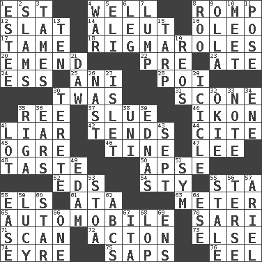 ACROSS 1. Eastern Standard Time (abbr.) 4. Water source 8. Frolic 12. Narrow board 14. Native American of Southwest Alaska 16. Margarine 17. Docile 18. Complicated, petty procedures 20. Make improvements or corrections to 22. Before (prefix) 23. Had dinner 24. Double-curved letter 25. Cuckoo 28. Luau course 30. It was, poetically 31. Biscuitlike quick bread 35. Portuguese money of account (variant) 37. Turn sharply 40. Picture 41. One who doesn't tell the truth 42. Watches over 44. Quote 45. Legendary monster 46. Prong on a fork 47. Area sheltered from the wind 48. Clothes sense 50. Domed church section 52. Begley and Asner 54. Filthy place 55. R.R. building 58. Raised railways 61. _ moment's notice (2 wds.) 63. Distance measurement 65. Form of transportation 70. Indian skirt 71. Glance over 72. 13-14th century defensive garment 73. Otherwise 74. Jane of fiction 75. Plant excrements 76. Snakelike fish DOWN 1. First name in cosmetics 2. Criticizes harshly 3. Makes less strong or intense 4. Armed conflict 5. Biblical high priest 6. Part of a journey 7. Mass 8. Friend of Pooh 9. Rounded earthenware pot or jar 10. Confront 11. Introduce or present, as a question 13. Nine, plus one 15. Canvas cover 19. Vintage cars 21. Obsolete 26. Political cartoonist Thomas 27. Small island 29. Tapering mass of hanging ice 30. Cigar-shaped 32. Migrant worker of the '30s 33. Make mention of 34. Compass dir. 35. Capital of Latvia 36. Hearing organs 38. Corn or form start 39. Ferber et al. 41. Car dealer's back yard 43. Back-to-school mo. 49. Dutch treat 51. Symbol (abbr.) 53. Portico 55. Having lost freshness 56. Laconic 57. Satellite of Uranus 58. Relaxation 59. "I Love _" 60. Play the lead 62. Lettered men learn these first 64. Compass dir. 66. Single 67. Call ___ day 68. Chop off 69. Followers of ems