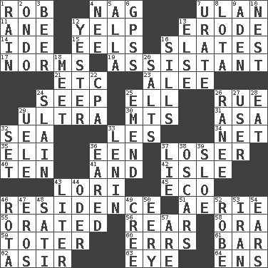 ACROSS 1. Director Reiner 4. Tired old horse 7. ____ Bator 11. A saturated hydrocarbon 12. Sharp bark 13. Eat (away) 14. Binary compound 15. Snakelike fish 16. Chalkboards 17. Typical models 19. Aide 21. And so on (abbr.) 23. Toward shelter 24. Ooze 25. Pipe bend 26. Regret 29. Extreme 30. Mountains (abbr.) 31. White ___ sheet 32. Ocean 33. French article 34. Fish or hair follower 35. Biblical high priest 36. Car or cant ending 37. Failure 40. "___ Little Indians" 41. Also 42. Small island 43. Australian parrot (variant) 45. Environmental prefix 46. Dwelling 51. Nest on high 55. Spoke pompously 56. Rump 58. Mouth or opening 59. Carrier 60. Blunders 61. Long, evenly shaped piece 62. SW Saudi Arabia district 63. Sight organ 64. Followers of ems DOWN 1. Water falling in drops from the sky 2. Southwest Nigerian state 3. Fermented drink made from hops 4. Born 5. Silent film actress Nazimova 6. Global Positioning Systems (abbr.) 7. A salt of uric acid 8. Globular water bottle used in Asia 9. An important port of Yemen 10. A home for chicks 12. Of or pertaining to yesterday 13. Otherwise 16. Beverly of Met fame 18. Rendezvous 20. Table seasonings 22. Tax preparer (abbr.) 24. Killed 25. Make improvements or corrections to 26. Indian princess (variant) 27. One who makes use of a thing 28. Ingest 29. Ubangi River tributary 32. Put into a specified state 33. Soviet premier 1918-24 36. Having ears or earlike features 37. Falsehood 38. Motion picture awards 39. A type of plum 43. 61 cubic inches 44. River in Europe 46. Roll call or roster of names 47. Greek god of love 48. Suttee (variant) 49. Algonquian 50. Suggestive of the supernatural 52. Loose flowing garment 53. SW Asia republic 54. Hearing organs 57. "We ___ not amused" (Victoria)