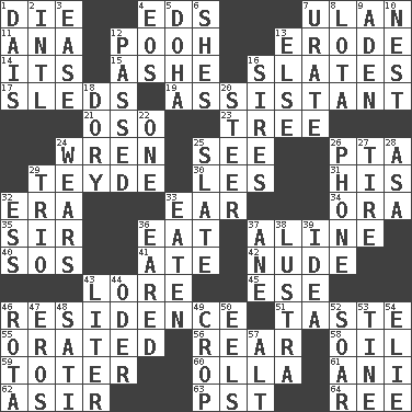 ACROSS 1. Expire 4. Begley and Asner 7. Uhlan (variant) 11. Santa ___, CA 12. "Silly old bear" 13. Eat (away) 14. ___ a Wonderful Life 15. American tennis player Robert 16. Chalkboards 17. Bobsleighs 19. Aide 21. Bear (Spanish) 23. Family _ (genealogy) 24. Songbird 25. Perceive with the eye 26. Parent Teacher Assoc. 29. Miss Universe 1986, Barbara Palacios _ 30. French article 31. Part of HMS, perhaps 32. Epoch 33. Hearing organ 34. Mouth or opening 35. Title for a knight 36. Erode 37. Place in a line 40. Distress signal 41. Had dinner 42. Naked 43. Old wives' tales, e.g. 45. Compass dir. 46. Dwelling 51. Clothes sense 55. Declaimed 56. Buttocks 58. Petroleum 59. Carrier 60. Rounded earthenware pot or jar 61. Cuckoo 62. SW Saudi Arabia district 63. Pacific Standard Time (abbr.) 64. To riddle DOWN 1. Raised platform 2. International (abbr.) 3. Relaxation 4. Greek goddess of the dawn 5. Capital of the state of Qatar 6. "______ My Girl" (Turtles hit) 7. A salt of uric acid 8. Globular water bottle used in Asia 9. Arabian gulf 10. Egg locale 12. Went by 13. Otherwise 16. Fathers 18. Rowboat 20. Guide 22. Single 24. Erodes 25. Schedule 26. Give a jingle 27. Hoop that covers a wheel 28. White ___ sheet 29. Musical group of three 32. Curvy letter 33. Eroded 36. Having ears or earlike features 37. A saturated hydrocarbon 38. A period of five years 39. It may be bright or harebrained 43. 61 cubic inches 44. Baltic tributary 46. Round or rotation of duties 47. Greek god of love 48. Suttee (variant) 49. Riding implement 50. Snakelike fish 52. Fly high 53. Prong on a fork 54. Writer Wiesel 57. Keyboard modifier key