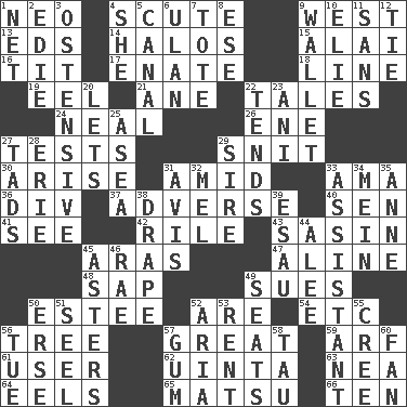 ACROSS 1. Modern: prefix 4. Snake scale 9. Compass direction 13. Begley and Asner 14. Rings 15. Mountain range southwest of Kyrgyzstan 16. Teat (slang) 17. Related on the mother's side 18. Actor's bit 19. Snakelike fish 21. One (Scot) 22. Falsehoods 24. Anneal 26. Compass dir. 27. Trials 29. In a ____ (agitated or irritated) 30. Ascend 31. Among 33. Housemaid (var.) 36. HTML Container Element 37. Contrary to your interests or welfare 40. Elected rep. 41. Perceive with the eye 42. Cause heat under the collar 43. Indian antelope 45. Ancient river in northeast Turkey 47. Place in a line 48. Plant excrement 49. Institutes legal proceedings 50. First name in cosmetics 52. "We ___ not amused" (Victoria) 54. And so on (abbr.) 56. Family _ (genealogy) 57. Relatively large 59. Sandy's bark 61. One who makes use of a thing 62. National forest in Provo, Utah 63. Teachers' org. 64. Snakelike fish 65. Taiwanese island in East China Sea 66. Nine, plus one DOWN 1. Fish or hair follower 2. Singer Brickell 3. Clearly or manifestly demonstrative 4. A female animal or person 5. Lessep's creation 6. Uhlan (variant) 7. Carry 8. Compass dir. 9. Place for singles 10. Writer Wiesel 11. Without 12. Make a knot 20. Allows 22. Looks after 23. Black tropical American cuckoo 25. At sea 27. Bits 28. One of the Great Lakes 29. The founder of a family 31. Opinion 32. Cartoonist voice _ Blanc 33. Helper 34. Count _ (2 wds.) 35. Singer Murray 38. Window treatment 39. Son of Isaac 44. Toward shelter 45. Michaelmas daisies 46. Actress Charlotte 49. Theater features 50. Celtic language 51. Stitch closed the eyes of (a falcon) 52. Operatic vocal solo 53. Monthly bill 55. Algonquian 56. Third day of the wk. 57. Chewing product 58. The 19th letter of the Greek alphabet 60. Avid follower