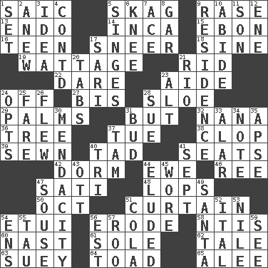 ACROSS 1. Ketch in the Levant 5. Heroin 9. Raze (variant) 13. Inside; within (prefix) 14. South American Indian 15. Inky black, to poets 16. Adolescent 17. Contemptuous expression 18. Trig term 19. Electrical Measurement 21. To free from 22. Have the gumption 23. Helper 24. No longer planned or scheduled 27. Twice 28. _ gin 29. Insides of hands 31. Yet 32. Grandmother 36. Woody plant 37. Third day of the wk. 38. Hoof sound 39. Stitched 40. Small boy 41. Theater features 42. Dormintory (informal) 44. She-sheep 46. Portuguese money of account (variant) 47. Suttee (variant) 48. Chops off 50. Sep. follower 51. Window treatment 54. Needle holder 56. Eat (away) 58. Nuclear Threat Initiatives 60. Political cartoonist Thomas 61. Not divided or shared with others 62. Story 63. Chop _ 64. Frog relative 65. Toward shelter DOWN 1. Arrange properly for use 2. Afresh 3. The content of cognition 4. Continued (abbr.) 5. Burns superficially 6. Leg joint 7. Adept person 8. Slender fish 9. Dwelling 10. Tolerate 11. Manchild 12. Compass dir. 17. Indian skirt 20. Bar bills 21. _ de Janeiro 23. The first octave above the treble staff 24. Elects 25. Conductor's collection 26. Soared 28. Institute legal proceedings 30. Ananias' fault 31. Partially opened flower 33. Having or resembling wings 34. Observe 35. Domed church section 37. Scottish cap 40. Three (prefix) 41. Back-to-school mo. 43. Baseball player Mel 44. Evaded 45. Had on 47. Lush 49. Before Barbara or Clara 51. Root beer relative 52. Slanted text style (abbr.) 53. Mediterranean tributary 54. Followers of ems 55. The 19th letter of the Greek alphabet 56. Eastern Standard Time (abbr.) 57. Friend of Pooh 59. Perceive with the eye