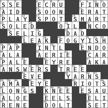 ACROSS 1. Compass dir. 4. Shade of tan 8. A pale, very dry sherry 12. Help 13. Within a short period 14. Part of Q.E.F. 15. Shaw product 17. Specific locale 18. Don Adams' spy role 19. Having a sole or soles 21. Lubricate 23. Non-commissioned officer (abbr.) 24. Former Milwaukee Brewers owner Bud 26. Male parent 28. Path through which fluid escapes 30. Out of fashion; old fashioned 34. Infant food 37. International (abbr.) 39. Inside; within (prefix) 40. Wing 41. Nest on high 43. Auto 44. Light colored 46. Jane of fiction 47. Alias (abbr.) 48. Responds (to) 51. Woody plant 54. First lady 55. Entertaining tales 58. Housemaid (var.) 61. Sight organ 63. Disturbances 65. Yearns 67. Leg joint 71. He sold his birthright 72. Medicinal plant 73. Snakelike fish 74. Biblical high priest 75. French philosopher Descartes 76. Stupid person 77. Arrange properly for use DOWN 1. Plant excrements 2. Grain storage towers 3. Peak District village in England 4. Curvy letter 5. Police officer (slang) 6. Friend of Pooh 7. To (old English) 8. Opposite of masc. 9. SW Asia republic 10. Drug cop 11. "Beetle Bailey" pooch 16. Shout 18. Volcanic refuse 20. Pass on 22. Wedding promise 25. Greek goddess of the earth (variant) 27. Color 29. Leg joints 30. Seductive woman who exploits men 31. South American Indian 32. Neighbor of Neb. 33. Israeli folk dance 34. Dad 35. ____ Jay Lerner 36. Friends 38. Attempt to accomplish something 42. Suggestive of the supernatural 45. She-sheep 49. Nights before holidays 50. Marina Del _, California 52. Ewer handle 53. One of the Great Lakes 56. Olfactory organs 57. Having lost freshness 58. Having or resembling wings 59. Undercover agent 60. At once, immediately (arch.) 62. Made supply last 64. Set of matching outer garments 66. Unit of force equal to gravity 68. Modern: prefix 69. Pipe bend 70. Eastern Standard Time (abbr.)