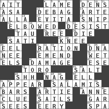 ACROSS 1. Small island 4. Unable to walk 8. Hiding places for outlaws 12. White ___ sheet 13. Debunk (Brit. slang) 14. Johnson of "Laugh-In" 15. Silent film actress Nazimova 17. Webber/Rice musical 18. Sever or remove by pinching or nipping 19. Turned at an angle; bent 21. Cease 23. The 19th letter of the Greek alphabet 24. To sift 26. Pass on 27. Suttee (variant) 28. Leg joint 30. Snakelike fish 31. Food allowance for one day 34. Heredity factor (abbr.) 37. Born 38. Make improvements or corrections to 39. Soggy 40. Raised railways 41. Break 42. Compass dir. 43. "Corrida" creature 44. Table seasoning 46. Quiet! 47. Tired old horse 50. Pipe bend 51. Seem 54. Deli grouping 57. Oblong pieces of solid material 58. Nick name for Arthur 60. Queen of England 1702-14 62. A slight indication 63. Travel by water 64. Slender fish 65. Observes 66. Suggestive of the supernatural 67. Health resort DOWN 1. American Automobile Association (abbr.) 2. Capri or Wright 3. Baron Munchausen's specialties 4. Prying instrument 5. Tolerate 6. Floor covering 7. Mild oath 8. Hyrax 9. Bert's buddy 10. Nuclear Threat Initiatives 11. Back-to-school mo. 13. Morning condensation 16. Blind as ____ 20. Fr. "Yes" 22. Genesis locale 25. Supplementing with great effort 27. Stitch closed the eyes of (a falcon) 29. Connecting point 30. Compass dir. 31. Buttocks 32. ID or VA city 33. Beverage made from leaves 34. Homes 35. Egg locale 36. Had dinner 41. Capital of the state of Qatar 43. College papers 44. Ocean 45. _ mater 46. Disorder 48. Moving or stirring 49. Lightheartedly 51. Lettered men learn these first 52. Light colored 53. To erase 55. French article 56. Fastener 59. Actress Charlotte 61. Period
