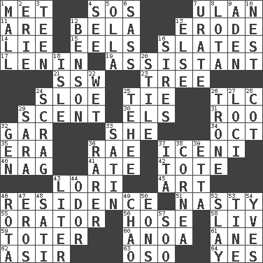 ACROSS 1. Was introduced to 4. Distress signal 7. ____ Bator 11. "We ___ not amused" (Victoria) 12. Actor Lugosi 13. Eat (away) 14. Falsehood 15. Snakelike fish 16. Chalkboards 17. Soviet premier 1918-24 19. Aide 21. Compass dir. 23. Family _ (genealogy) 24. _ gin 25. Neckwear 26. Affectionate concern, for short 29. Aroma 30. Raised railways 31. Friend of Pooh 32. Slender fish 33. A female animal or person 34. Sep. follower 35. Epoch 36. Actress Charlotte 37. Ancient Celtic tribe of eastern Britain 40. Tired old horse 41. Had dinner 42. Haul 43. Australian parrot (variant) 45. Nonscientific branch of learning 46. Home 51. Offensive 55. Speaker 56. Stockings 58. 54 in ancient Rome 59. Carrier 60. Small Philippine buffalo 61. A saturated hydrocarbon 62. SW Saudi Arabia district 63. Bear (Spanish) 64. Consenting reply DOWN 1. Promenade 2. One of the Great Lakes 3. Adolescent 4. Perceive with the eye 5. Rounded earthenware pot or jar 6. Backtalk 7. A salt of uric acid 8. Globular water bottle used in Asia 9. Arabian gulf 10. Egg locale 12. Gillaume's butler role 13. Otherwise 16. Titles for men of rank and authority 18. Capri or Wright 20. Vertical member of a panel or frame 22. Dripping 24. Strangle with an iron collar 25. Giggle 26. Heavy duty weighing machine 27. Event scenes 28. Small bed 29. "Two Mules for Sister ____" 32. Commissioned mil. rank 33. Smooth fabric 36. Less widely known 37. Call ___ day 38. Pupil covering 39. Singer James 43. 61 cubic inches 44. Aroma 46. Roll call or roster of names 47. Greek god of love 48. Suttee (variant) 49. US Secretary of Labor Elaine L. _ 50. Immeasurably long periods of time 52. Kill 53. Prong on a fork 54. Jacques Cousteau's middle name 57. "Barney Miller" actor Jack