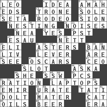 ACROSS 1. Lion 4. The content of cognition 8. Nanny 12. Begley and Asner 13. Heavy duty weighing machine 14. Flatfish 15. Stalk of a moss capsule 17. Cowboy competition 18. The Jewish people; Israel 19. Inhabiting a nest 21. Annoying sounds 23. Teachers' org. 24. Consenting reply 26. Pacific Standard Time (abbr.) 27. He sold his birthright 28. Remaining after all deductions 30. Connecticut Ivy Leaguer 31. Michaelmas daisies 34. Forbid 37. 54 in ancient Rome 38. Crowbar 39. "We ___ not amused" (Victoria) 40. Observe 41. Motion picture awards 42. Corporate head (abbr.) 43. Narrow opening 44. "____ silly question..." 46. A female animal or person 47. Compass dir. 50. Personal Computers (abbr.) 51. Food allowance for one day 54. Portable computers 57. Independent ruler or chieftain 58. A salt of uric acid 60. Jacques of French films 62. Dunce 63. Mother 64. Feline 65. Lubricates 66. Fermented drink made from hops 67. Epoch DOWN 1. French article 2. Locale of original sin 3. Clearly or manifestly demonstrative 4. Literary sarcasm 5. Evade 6. Compass dir. 7. Age 8. Aid 9. Damp 10. Medicinal plant 11. Coop moms 13. Three (prefix) 16. At sea 20. The 19th letter of the Greek alphabet 22. Chooses 25. Contemptuous expression 27. Writer Wiesel 29. Blunders 30. Raised railways 31. In addition 32. Religious groups 33. Federal power corp. 34. Keyboard key 35. Type of rug 36. Modern: prefix 41. Butter sub 43. Chest coverings 44. Fitting 45. Native of Scotland 46. Free of sound 48. Schedule 49. Wetness 51. Redecorate 52. Mine, in Marseilles 53. Unfeeling 55. For each 56. Play the lead 59. Actress Charlotte 61. Call ___ day