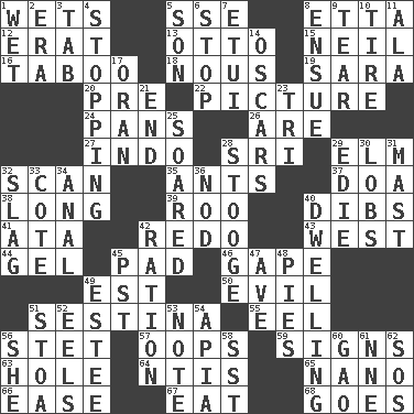 ACROSS 1. Soaks 5. Compass dir. 8. Singer James 12. Part of Q.E.F. 13. Von Bismarck 15. Famous astronaut Armstrong 16. Off limits 18. Horse sense 19. "Two Mules for Sister ____" 20. Before (prefix) 22. Photo 24. Baking dishes 26. "We ___ not amused" (Victoria) 27. _ china 28. _ Lanka 29. Shade tree 32. Examine hastily 35. Pismires 37. ___ good deed 38. Yearn 39. Friend of Pooh 40. Rights 41. _ moment's notice (2 wds.) 42. Do over again 43. Compass direction 44. Set 45. Groovy apt. 46. Yawn 49. Eastern Standard Time (abbr.) 50. Tending to cause great harm 51. French poetic form 55. Snakelike fish 56. Proofreading order 57. I made a mistake 59. Signals 63. Hollow 64. Nuclear Threat Initiatives 65. Billionth: prefix 66. Relaxation 67. Ingest 68. Moves DOWN 1. Dripping 2. Epoch 3. Bar bill 4. Halting 5. Male offspring 6. Obstruct or block passage 7. Needle case 8. Take place subsequently 9. Separate forcefully 10. Hoop that covers a wheel 11. Chicken ___ king 14. Motion picture awards 17. NW Algerian seaport 21. Conclusion 23. Three (prefix) 25. Flew 28. Moe Howard, for one 29. Singer Brickell 30. Tennis shots 31. Vertical spar for supporting sails 32. Volcanic refuse 33. ____ d'Azur (French Riviera) 34. Of or related to the anus 36. Lower and raise head in agreement 40. Residence 42. Food allowance for one day 45. Pacific Standard Time (abbr.) 47. "___ Maria" 48. Sliced desserts 49. First name in cosmetics 51. Portico 52. Snakelike fish 53. Short letter 54. Capital of Western Samoa 56. A female animal or person 58. Fast jet (abbr.) 60. E Mali city 61. Compass dir. 62. Mayday