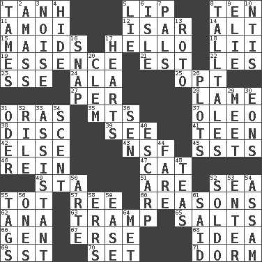 ACROSS 1. Hyperbolic tangent 5. Mouth edge 8. Nine, plus one 11. Mine, in Marseilles 12. Austrian river, tributary to the Danube 14. The first octave above the treble staff 15. Women servants 17. Phone greeting 18. Cards in a Roman deck? 19. Core 21. Eastern Standard Time (abbr.) 22. French article 23. Compass dir. 24. Chicken ___ king 25. Choose 27. For each 28. Unable to walk 31. Mouths or openings 35. Mountains (abbr.) 37. Margarine 38. Flat circle 39. Observe 41. Adolescent 42. Otherwise 43. Science/research agcy. 45. Fast planes 46. It's straight from the horse's mouth 47. Feline 49. R.R. building 51. "We ___ not amused" (Victoria) 52. Ocean 55. Small child 57. Portuguese money of account (variant) 60. Thinks logically 62. Santa ___, CA 63. _____ steamer (cargo ship) 65. Table seasonings 66. Commissioned military rank (abbr.) 67. Celtic language 68. It may be bright or harebrained 69. Fast jet (abbr.) 70. Arrange properly for use 71. Dormintory (informal) DOWN 1. Corrects by punishment or discipline 2. Collect or gather 3. Annoying sound 4. Flintstone garb 5. Untruth 6. Capri or Wright 7. Friends 8. Baron Munchausen's specialties 9. Writer Wiesel 10. Nuclear Threat Initiatives 13. Printing process, for short 16. Fastener 17. Centers 20. To starve (Brit.) 26. Small pieces of grounds 29. Confront 30. Immeasurably long periods of time 31. River in Europe 32. Cause heat under the collar 33. Helper 34. Aroma 36. Elected rep. 40. Fortification 44. Conductor's collection 48. Afternoon social gatherings 50. Johnson of "Laugh-In" 52. Twentieth part of a lira 53. Keyboard key 54. Indian state 55. Labels 56. Washington bills 58. Blunders 59. Comfort 61. Stated 64. Was introduced to
