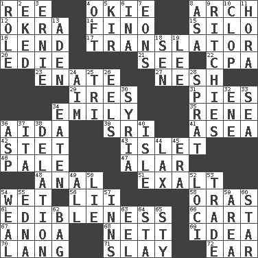 ACROSS 1. To sift 4. Migrant worker of the '30s 8. Bowlike part 12. Gumbo ingredient 14. A pale, very dry sherry 15. Grain storage tower 16. Grant temporary use of 17. Interpreter 20. Singer Brickell 21. Observe 22. Numbers guy (abbr.) 23. Related on the mother's side 27. Delicate 29. Angers 31. Sliced desserts 34. Poet Dickinson 35. French philosopher Descartes 36. Opera by Verdi 39. Indian title of respect (Mr.) 41. Toward the sea 42. Proofreading order 43. Small island 46. Diluted with white 47. Having or resembling wings 48. Of or related to the anus 51. Glorify 54. Dripping 56. Cards in a Roman deck? 58. Mouths or openings 61. The property of being fit to eat 66. Haul 67. Small Philippine buffalo 68. Remaining after all deductions 69. The main thing one is thinking about 70. Long (Scottish) 71. Kill 72. Ewer handle DOWN 1. Hero or heavy, e.g. 2. Made supply last 3. Bert's buddy 4. Often (poetically) 5. Apertif with cassis 6. _ tizzy (2 wds.) 7. Immeasurably long periods of time 8. White ___ sheet 9. Actors Guy, Robert Welles, and Clint 10. Hoof sound 11. Israeli folk dance 13. Arabian gulf 18. Elected rep. 19. Area sheltered from the wind 24. Direct toward a target or goal 25. Three (prefix) 26. Snakelike fish 28. Small fatty European fish 30. Damascus' land 32. Compass dir. 33. Ocean 34. Eroded 36. Viper 37. Call ___ day 38. Accusation by an informer 40. Small island 44. Not strict 45. Epoch 49. 100% 50. Whopper 52. Venues 53. Buy and sell 54. Welt 55. Pulitzer Prize-winning author Ferber 57. Taverns 59. Length times width 60. Play the lead 62. Container for groceries 63. Snakelike fish 64. R.R. building 65. Filthy place