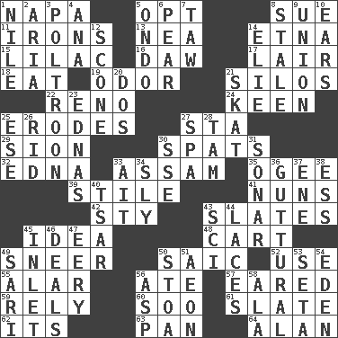 ACROSS 1. California wine valley 5. Elect 8. Institute legal proceedings 11. Metal shackles 13. Teachers' org. 14. Inactive volcano in Sicily 15. Pale purple color 16. Obsolete 17. Den 18. Consume 19. Aroma 21. Grain storage towers 22. Former U.S. Attorney General Janet 24. Peachy ____! 25. Eats (away) 27. R.R. building 29. The Jewish people; Israel 30. Arguments over trivial matters 32. Pulitzer Prize-winning author Ferber 33. Indian state 35. Double curve, resembling the letter S 39. Vertical member of a panel or frame 41. Religious women 42. Filthy place 43. Chalkboards 45. It may be bright or harebrained 48. Draw slowly or heavily 49. Scornful expression 50. Ketch in the Levant 52. Purpose 55. Having or resembling wings 56. Had dinner 57. Having ears or earlike features 59. Have confidence or faith in 60. "Barney Miller" actor Jack 61. Chalkboard 62. It is 63. Baking dish 64. ____ Jay Lerner DOWN 1. "Death on the ____" 2. Roberta Peters solo 3. Characterized by complete cowardliness 4. Santa ___, CA 5. Southwest Nigerian state 6. Lightbulb-shaped fruit 7. The 23rd letter of the Hebrew alphabet 8. Showing deterioration from age 9. The state of being joined or united 10. Hearing organs 12. Biscuitlike quick bread 14. Writer Wiesel 20. Two (Sp.) 21. Three-handed card game 23. Ferber et al. 25. Compass dir. 26. To free from 27. Health resort 28. Scottish cap 30. Compass dir. 31. Echolocation 33. Small island 34. Insidious 36. From the throat 37. Compass dir. 38. Curvy letter 40. Russian ruler of old 43. _-fi 44. Shoestrings 45. An arm off of a larger body of water 46. Allots cards 47. Suggestive of the supernatural 49. Indian skirt 50. Portico 51. A really long time 53. Bristle 54. Locale of original sin 56. Viper 58. Chicken ___ king