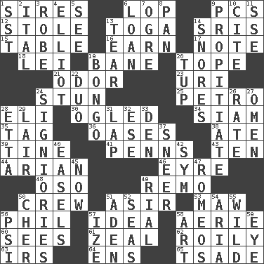 ACROSS 1. Begets 6. Trim (branches) 9. Personal Computers (abbr.) 12. Took without asking 13. Ancient Roman robe 14. Indian titles of respect 15. Eating place 16. Merit 17. Observe 18. Luau accessory 19. Object of repulsion 20. Drink excessively 21. Aroma 23. RI univ. 24. Make senseless or dizzy 25. Stone: prefix 28. Connecticut Ivy Leaguer 30. Stared at amorously 34. Thailand, formerly 35. Label 36. Fertile tracts in a desert 38. Had dinner 39. Prong on a fork 41. Actor Sean's family 43. Nine, plus one 44. Believer in; advocate of (suffix) 46. Jane of fiction 48. Bear (Spanish) 49. San ____ (Riviera town) 50. Ship's personnel 51. SW Saudi Arabia district 53. Informal term for the mouth 56. Silvers or Donahue 57. It may be bright or harebrained 58. Nest on high 60. Perceives with the eye 61. Ardor 62. Agitated, as a liquid 63. Big collection agency 64. Followers of ems 65. Sadhe (variant) DOWN 1. Fast jet (abbr.) 2. Slanted text style (abbr.) 3. Loose flowing garment 4. American author Paul (1891-1958) 5. Observe 6. Grant temporary use of 7. Legendary monster 8. Baking dish 9. Conciliate 10. Quote 11. Compass dir. 13. Pull into pieces 14. Sounds asleep 19. Beat drum 20. Uncastrated adult male sheep 22. Superhero pair 24. Seigniories (variant) 26. Pace 27. Sign of things to come 28. Singer James 29. Den 31. Pet locale 32. Compass dir. 33. Lair 37. Contemptuous expression 40. Artist's stands 42. Symbol (abbr.) 45. Immediately 47. Lover boys 49. Monetary unit of Yemen 50. "Mermaids" star 51. An important port of Yemen 52. Oceans 54. Roberta Peters solo 55. Uncontrolled 56. Air pressure measure (abbr.) 57. Ending with capital 58. Nonscientific branch of learning 59. Sight organ