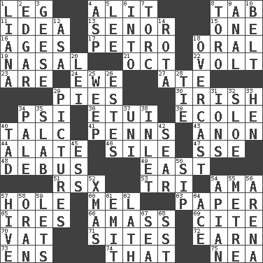 ACROSS 1. Part of a journey 4. Set down 8. Bar bill 11. The content of cognition 13. Sir (Sp.) 15. Single 16. Ripens 17. Stone: prefix 18. Taken by mouth 19. Relating to the nose 21. Sep. follower 22. Electrical Unit 23. "We ___ not amused" (Victoria) 24. She-sheep 27. Had dinner 29. Sliced desserts 30. From or relating to Ireland 34. Air pressure measure (abbr.) 36. Needle holder 39. Learning spot: Fr. 40. Baby powder 41. Actor Sean's family 43. At once, immediately (arch.) 44. Having winglike extensions 46. Drop; flow; fall 47. Compass dir. 48. To get out of a bus 49. Compass direction 51. Acura sports coupe 53. Three (prefix) 54. Housemaid (var.) 57. Opening into or through something 60. Cartoonist voice _ Blanc 63. Some stationery 65. Angers 66. Collect or gather 69. Quote 70. Large container 71. Settings 72. Merit 73. Followers of ems 74. Not this but _ 75. Teachers' org. DOWN 1. Climbing, woody, usually tropical vines 2. _ Allan Poe 3. Honkers 4. Viper 5. Area sheltered from the wind 6. To the inside or interior of 7. Torque (variant) 8. "Corrida" creature 9. Of or related to the anus 10. Waist strap 12. White ___ sheet 14. Round or rotation of duties 18. Cloudy 20. Flowery wreath 25. Shed a tear 26. _____ Park, CO 28. Neckwear 29. Photos 31. Charged atoms 32. _ gin 33. Layer 34. Diluted with white 35. Thick slice 37. University (slang) 38. An arm off of a larger body of water 40. Small amount or degree 42. Wither 45. Double-curved letter 50. Small drink 52. Dec. holiday 54. Bee-related 55. Distance measurement (Brit.) 56. Sports stadium 57. Hub of activity 58. NW Algerian seaport 59. Allows 61. Give off 62. Thin strip of wood or metal 64. Adept person 67. Ocean 68. Fast jet (abbr.)