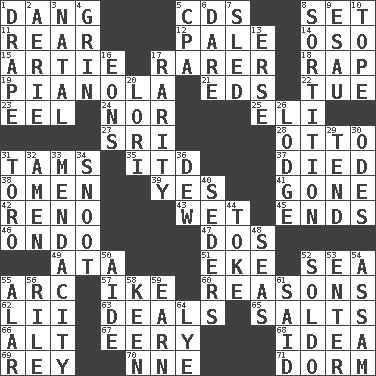 ACROSS 1. Mild oath, euphamism for damn 5. Music discs 8. Put into a specified state 11. Rump 12. Diluted with white 14. Bear (Spanish) 15. Nick name for Arthur 17. More uncommon 18. Hit sharply and swiftly 19. Player piano 21. Begley and Asner 22. Third day of the wk. 23. Snakelike fish 24. Or not 25. Biblical high priest 27. _ Lanka 28. Von Bismarck 31. Scottish caps 35. It would 37. Passed on 38. Sign of something about to happen 39. Affirmative reply 41. Went 42. Former U.S. Attorney General Janet 43. Dripping 45. Conclusions 46. Southwest Nigerian state 47. Two (Sp.) 49. "One Day ___ Time" 51. Make supply last 52. Ocean 55. Curve 57. D.D.E's nickname 60. Thinks logically 62. Cards in a Roman deck? 63. Allots cards 65. Table seasonings 66. The first octave above the treble staff 67. Suggestive of the supernatural 68. The content of cognition 69. Marina Del _, California 70. Compass dir. 71. Dormintory (informal) DOWN 1. Window treatment 2. Nest on high 3. Brizilian seaport 4. Smile widely 5. Tax preparer (abbr.) 6. Have the gumption 7. Downhill vehicle 8. Conclusion 9. Son of Isaac 10. Drink excessively 13. Celtic language 16. Immeasurably long periods of time 17. Noteworthy scarcity 20. Australian parrot (variant) 26. Cabin 29. Look after 30. Lyric poems 31. "Corrida" creature 32. So be it 33. Ananias' fault 34. Snout, nose 36. Morning condensation 40. Spring feasts 44. Puff or smoke 48. Oceans 50. Assistant 52. Twentieth part of a lira 53. Keyboard key 54. Indian state 55. Having or resembling wings 56. Cause heat under the collar 58. Peachy ____! 59. Merit 61. Alleged 64. Potassium hydroxide