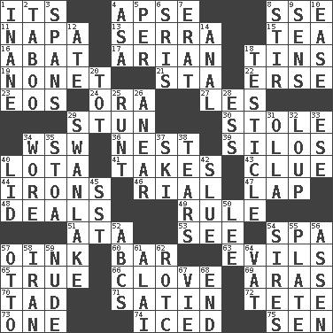 ACROSS 1. ___ a Wonderful Life 4. Domed church section 8. Compass dir. 11. California wine valley 13. Spanish missionary in California 15. Beverage made from leaves 16. Blind as ____ 17. Believer in; advocate of (suffix) 18. Canisters 19. Music written for nine 21. R.R. building 22. Celtic language 23. Greek goddess of the dawn 24. Mouth or opening 27. French article 29. Astound 30. Took without asking 34. Compass dir. 36. A home for chicks 39. Grain storage towers 40. Globular water bottle used in Asia 41. Receives possession of 43. A slight indication 44. Removes the wrinkles 46. Monetary unit of Yemen 47. Infant locale 48. Allots cards 49. Governing power 51. "One Day ___ Time" 53. Perceive with the eye 54. Health resort 57. Pig sound 60. Long, evenly shaped piece 63. Vices 65. Loyal 66. Garlic unit 69. Ancient river in northeast Turkey 70. Bit 71. Smooth fabric 72. Wig 73. Single 74. On the rocks 75. Elected rep. DOWN 1. Lacking in sense or substance 2. Off limits 3. Connects, as a bridge 4. White ___ sheet 5. For each 6. Indian titles of respect 7. Part of Q.E.F. 8. Tumult 9. Elected reps. 10. Relaxation 12. Had dinner 14. Of or related to the anus 18. One of the two male reproductive glands 20. Small child 25. The smallest animal of a litter 26. Approach 28. Double-curved letter 29. Tchaikovsky ballet 31. Spanish pot 32. Central Nebraska county 33. Compass dir. 34. Had on 35. Portico 37. What Jean-Claude Killy likes to do 38. Pulls into pieces 40. Hat (slang) 42. Turn sharply 45. Fast jet (abbr.) 50. Area sheltered from the wind 52. Lettered men learn these first 54. Male parents of animals 55. Food holder 56. NE Netherlands city 57. Von Bismarck 58. SW Asia republic 59. Unadorned 61. Jai _ 62. College mil. group 64. Large container 67. Compete 68. Conclude