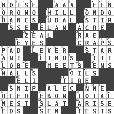 ACROSS 1. Annoying sound 6. American Automobile Association (abbr.) 9. Car or cant ending 12. U. of Maine site 13. Land elevation 14. Southwest Nigerian state 15. Natives or inhabitants of Denmark 16. Freehold land 17. Commotion 18. Compass dir. 19. Enthusiasm 20. Measure of real estate 21. Ardor 23. Actress Charlotte 24. Sight organs 25. Dice game 28. Writing tablet 30. Crowbar 34. Play the lead 35. Cuckoo 36. "_ and Lucy" (Charlie Brown theme song) 38. One more than two 39. Ear part 41. Confronts 43. Followers of ems 44. Promenades 46. Lubricates 48. Connecticut Ivy Leaguer 49. Become fatigued 50. Sever or remove by pinching or nipping 51. Actor Baldwin 53. Compass dir. 56. Butter sub 57. Inky black, to poets 58. "_____ Recall" 60. Egg locale 61. Narrow board 62. Ascend 63. Begley and Asner 64. Elected rep. 65. Trials DOWN 1. Lower and raise head in agreement 2. Mouths or openings 3. Charged particles 4. Dwarf with a sinus problem 5. Greek goddess of the dawn 6. Opera by Verdi 7. Actor Alda or Thicke 8. 100% 9. Pleas 10. Singer Brickell 11. Or not 13. Frame or body of a ship 14. Motion picture awards 19. Artist's stand 20. Curve 22. Snakelike fish 24. The property of being fit to eat 26. Ache 27. Indian titles of respect 28. Inside of hand 29. Small Philippine buffalo 31. Zeal 32. Compass dir. 33. Regret 37. Unemotional 40. American author Paul (1891-1958) 42. Title for a knight 45. Small drink 47. Poe poem 49. Portable shelter 50. Downhill vehicle 51. Competent 52. Grant temporary use of 54. Nuclear Threat Initiatives 55. Compass direction 56. Single 57. Double-curved letter 58. Make lace 59. French article
