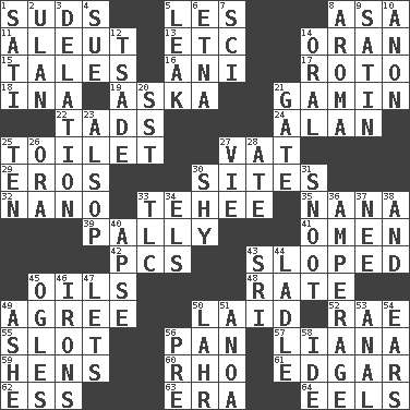 ACROSS 1. Beer foam 5. French article 8. White ___ sheet 11. Eskimo relative 13. And so on (abbr.) 14. NW Algerian seaport 15. Lies 16. Cuckoo 17. Printing process, for short 18. _ tizzy (2 wds.) 19. "____ silly question..." 21. Street urchin 22. Small amounts or degrees 24. ____ Jay Lerner 25. Bathroom plumbing fixture 27. Large container 29. Greek god of love 30. Settings 32. Billionth: prefix 33. Giggle 35. Nanny 39. Friendly 41. Sign of something about to happen 42. Personal Computers (abbr.) 43. Slanted 45. Lubricates 48. Assign a rank or rating to 49. Match 50. Put down 52. Actress Charlotte 55. Narrow opening 56. Baking dish 57. Woody, climbing, usually tropical plant 59. Coop moms 60. 17th letter of the Greek alphabet 61. _ Allan Poe 62. Double-curved letter 63. Epoch 64. Snakelike fish DOWN 1. Suttee (variant) 2. ____ Bator, Mongolia 3. Accusation by an informer 4. Take to court 5. Path through which fluid escapes 6. Inactive volcano in Sicily 7. _-fi 8. Odor 9. Smooth fabric 10. At once, immediately (arch.) 12. Sadhe (variant) 14. Taken by mouth 20. Fast jet (abbr.) 21. Yard entry 23. Columnist Joseph or Stewart 25. "___ Little Indians" 26. Mouth or opening 27. Compete 28. Had dinner 30. Like a shrinking violet 31. Snout, nose 33. Affectionate concern, for short 34. Raised railways 36. Electrical Measurement 37. Born 38. Added to 40. Domed church section 43. Indian title of respect (Mr.) 44. Dipping utensil 45. Stares 46. Metal shackles 47. Allows 49. American tennis player Robert 50. Cowardly lion portrayer 51. Small Philippine buffalo 53. Of or related to the anus 54. Hearing organs 56. Before (prefix) 58. Binary compound