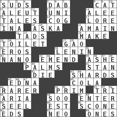 ACROSS 1. Soap bubbles 5. Apply (a substance) by light strokes 8. Domesticated feline 11. Eskimo relative 13. University (slang) 14. Toward shelter 15. Falsehoods 16. Gear tooth 17. Old wives' tales, e.g. 18. _ tizzy (2 wds.) 19. "____ silly question..." 21. At full speed 22. Small amounts or degrees 24. Cause to be 25. Rest room 27. E Mali city 29. Greek god of love 30. Soviet premier 1918-24 32. Billionth: prefix 33. Make improvements or corrections to 35. American tennis player Robert 39. Insides of hands 41. Comedian Laurel of Laurel & Hardy 42. Expire 43. Pottery fragments 45. Pulitzer Prize-winning author Ferber 48. Root beer relative 49. More valued for its uncommonness 50. Demure 52. Three (prefix) 55. Operatic vocal solo 56. "Barney Miller" actor Jack 57. Keyboard key 59. Stitch closed the eyes of (a falcon) 60. Eastern Standard Time (abbr.) 61. Biscuitlike quick bread 62. Begley and Asner 63. Modern: prefix 64. Singles DOWN 1. Suttee (variant) 2. Uhlan (variant) 3. Accusation by an informer 4. Take to court 5. Evade 6. Small Philippine buffalo 7. Of large size 8. Cover or conceal 9. Nest on high 10. Adolescent 12. Sadhe (variant) 14. _ mater 20. Fast jet (abbr.) 21. Mine, in Marseilles 23. Columnist Joseph or Stewart 25. Nine, plus one 26. Mouth or opening 27. Commissioned mil. rank 28. Added to 30. French article 31. Relating to the nose 33. Connecticut Ivy Leaguer 34. Madame (abbr.) 36. Ski resort town in Vermont 37. Possessed 38. Followers of ems 40. The sixth month of the Jewish calendar 43. _-fi 44. Residences 45. Having ears or earlike features 46. Frees from moisture 47. Actress Patricia 49. Raze (variant) 50. Introduce or present, as a question 51. Printing process, for short 53. French philosopher Descartes 54. Angers 56. Elected rep. 58. Non-commissioned officer (abbr.)
