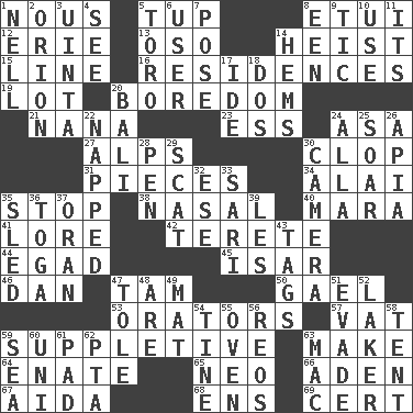 ACROSS 1. Horse sense 5. Uncastrated adult male sheep 8. Needle case 12. One of the Great Lakes 13. Bear (Spanish) 14. Robbery 15. Actor's bit 16. Dwellings 19. Car dealer's back yard 20. Mood resulting from idleness 21. Nanny 23. Curvy letter 24. White ___ sheet 27. High mountains 30. Hoof sound 31. Components 34. Jai _ 35. Obstruct or block passage 38. Rhinal 40. Hindu Mythology: god of death 41. Old wives' tales, e.g. 42. Cigar-shaped 44. Mild oath 45. Austrian river, tributary to the Danube 46. One of the 12 tribes of Israel 47. Scottish cap 50. Highlander 53. Speakers 57. Large container 59. Supplementary 63. Cause to be 64. Maternal 65. Modern: prefix 66. An important port of Yemen 67. Opera by Verdi 68. Followers of ems 69. Certainty DOWN 1. 1994 drama film starring Jodie Foster 2. Greek mythologigal hunter 3. National forest in Provo, Utah 4. Perceive with the eye 5. "Corrida" creature 6. One who makes use of a thing 7. Introduce or present, as a question 8. Car or cant ending 9. Nervous spasm 10. Purpose 11. It is 14. Folds over and sews together 17. Binary compound 18. Two (Sp.) 20. Indonesian resort city 22. Slept 24. Silent film actress Nazimova 25. Fly high 26. Capital of Western Samoa 28. Animal enclosure 29. Go away! 30. Device for capturing images 32. Compass dir. 33. Indian skirt 35. Downhill vehicle 36. Ancient Roman robe 37. Northwest Algerian city 39. French article 43. Labels 47. Lacquered or enameled metalware 48. "We ___ not amused" (Victoria) 49. Floor covering 51. Dodge 52. Member of a famous L.A. basketball team 54. Prong on a fork 55. Baking chamber 56. Vintage cars 58. Portable shelter 59. Ocean 60. Single; one (prefix) 61. Writing tablet 62. Parent Teacher Association (abbr.) 63. Big _