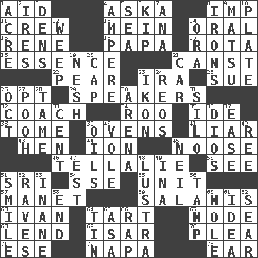 ACROSS 1. Assist 4. "____ silly question..." 8. Mischievous child 11. Group working together 13. Chow _ 14. Of the mouth 15. French philosopher Descartes 16. Dad 17. Roll call or roster of names 18. Core 21. 2nd pers. sing. pres. of can (arch.) 22. Lightbulb-shaped fruit 23. Lyricist Gershwin 25. Take to court 26. Elect 29. Orators 32. Team commander 34. Friend of Pooh 35. Binary compound 38. Heavy book 39. Baking chambers 41. One who doesn't tell the truth 43. Layer 44. Electrically charged atom 45. Trap for birds or small mammals 46. Copy Pinocchio 50. Observe 51. _ Lanka 54. Compass dir. 55. A single undivided whole 57. French painter Edouard 59. Deli grouping 63. "Terrible" tsar 64. Small pie 67. Method 68. Grant temporary use of 69. Austrian river, tributary to the Danube 70. Entreaty 71. Compass dir. 72. California wine valley 73. Ewer handle DOWN 1. Land measure 2. Angers 3. Hiding places for outlaws 4. Electrical Unit 5. Ocean 6. Monetary unit of Laos 7. Santa ___, CA 8. Metal shackles 9. Taiwanese island in East China Sea 10. Food holder 12. Shed a tear 14. Mouth or opening 19. Soft 20. Head covering 21. Auto 23. Image 24. Vintage cars 26. Sep. follower 27. "Silly old bear" 28. Docile 30. Sports stadium 31. Grain storage tower 33. Penny 36. "Vaya con ____" 37. Relaxation 39. Petroleums 40. Short-tailed, large-bodied rat 42. Portuguese money of account (variant) 45. Famous astronaut Armstrong 47. Eastern Standard Time (abbr.) 48. A period of five years 49. _ tizzy (2 wds.) 51. Grin 52. All-night dance parties 53. Lacking in sense or substance 56. Pack (down) 58. Conclude 60. Undercover agent 61. The main thing one is thinking about 62. Wither 64. Metal container 65. White ___ sheet 66. Hit sharply and swiftly