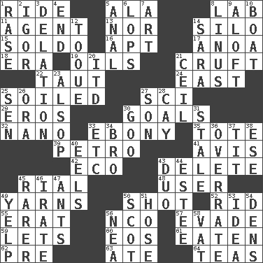 ACROSS 1. Travel on an animal 5. Insect wing 8. Experiment locale 11. Representative 13. Not either 14. Grain storage tower 15. Twentieth part of a lira 16. Fitting 17. Small Philippine buffalo 18. Epoch 19. Petroleums 21. An unpleasant substance 22. Tense 24. 90 degrees 25. Dirtied 27. _-fi 29. Greek god of love 30. Finish lines 32. Billionth: prefix 33. Black 35. Lug 39. Stone: prefix 41. Advice 42. Environmental prefix 43. Erase 45. Monetary unit of Yemen 48. One who uses or employs something 49. Tall tales 50. Guess 52. To free from 55. Part of Q.E.F. 56. Non-commissioned officer (abbr.) 57. Elude 59. Allows 60. Greek goddess of the dawn 61. Consumed 62. Before (prefix) 63. Had dinner 64. Beverages made from leaves DOWN 1. To erase 2. Russian composer Stravinsky 3. Conveyance 4. Conclude 5. Of or related to the anus 6. Chops off 7. Tate display 8. "_ and Lucy" (Charlie Brown theme song) 9. High up in or into the air 10. Water vessel 12. Woman's close-fitting hat 14. "Two Mules for Sister ____" 20. It would 21. To provide with a ceiling 23. Columnist Joseph or Stewart 25. Elected rep. 26. Mouth or opening 27. Boy, to dad 28. Island 30. Thick or sticky substance 31. Lacking originality or spontaneity 33. And so on (abbr.) 34. Sis' sibling 36. Make much ado about nothing 37. Teat (slang) 38. Compass dir. 40. Snakelike fish 43. Superhero pair 44. First name in cosmetics 45. More uncommon 46. Feeling or showing extreme anger 47. Pismires 49. Sharp bark 50. Highlander 51. Stockings 53. The main thing one is thinking about 54. Hiding places for outlaws 56. Teachers' org. 58. Large container