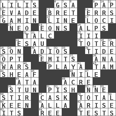 ACROSS 1. Ms. Damita and namesakes 6. Girls' org. (abbr.) 9. Infant food 12. Dodge 13. Cy Young winner Saberhagen 14. Blunders 15. Homeless child 16. Actor's bit 17. Venues 18. Modern: prefix 19. Immeasurably long periods of time 20. High mountains 21. Baby powder 23. One more than two 24. Son of Isaac 25. Carrier 28. Male child 30. Goodbye (Sp.) 34. Event that recurs at intervals 35. Choose 36. Gives off 38. Santa ___, CA 39. Armed conflicts 41. Beach, in Buenos Aires 43. Scottish cap 44. Bundle of cut stalks of grain 46. Mediterranean tributary 48. "One Day ___ Time" 49. Measure of real estate 50. Astound 51. Expression of disdain 53. Compass dir. 56. Commotion 57. Keg 58. "_____ Recall" 60. Peachy ____! 61. Silent film actress Nazimova 62. Ascend 63. ___ a Wonderful Life 64. Portuguese money of account (variant) 65. Trials DOWN 1. Part of a journey 2. _ the terrible 3. Unable to walk 4. Foolish or stupid persons 5. Elected rep. 6. Amused look 7. Elected reps. 8. Had dinner 9. Appease 10. Arches 11. Air pressure measure (abbr.) 13. Alliance 14. American author Paul (1891-1958) 19. Evade 20. Small island 22. American Automobile Association (abbr.) 24. Pleas 26. Pulitzer Prize-winning author Ferber 27. 480, 500 or 516 sheets of paper 28. Sty mamas 29. Brightly colored fish 31. Mischievous child 32. Lubricate 33. R.R. building 37. Synchronize (abbr.) 40. Titan orbits this 42. Atmosphere 45. Avid follower 47. Poe poem 49. "____ silly question..." 50. Proofreading order 51. Diluted with white 52. Capri or Wright 54. Nuclear Threat Initiatives 55. 90 degrees 56. What Jean-Claude Killy likes to do 57. 4-wheeled motor vehicle 58. Make lace 59. French article