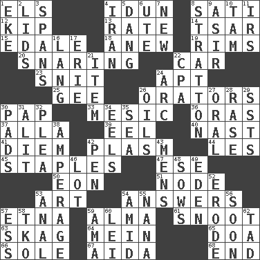 ACROSS 1. Raised railways 4. Goddess of spring and wife of Bragi 8. Suttee (variant) 12. Monetary unit of Laos 13. Assign a rank or rating to 14. Russian ruler of old 15. Peak District village in England 18. Afresh 19. Basketball hoops 20. Catching in a trap 22. 4-wheeled motor vehicle 23. In a ____ (agitated or irritated) 24. Fitting 25. Unit of force equal to gravity 26. Speakers 30. Infant food 33. Of or pertaining to a meson 36. Mouths or openings 37. Silent film actress Nazimova 39. Snakelike fish 40. Political cartoonist Thomas 41. South Vietnam president (1954) 42. Suffix with ecto or cyto 44. French article 45. Paper fasteners 47. Compass dir. 50. Age 51. Thickened enlargement 53. Tate display 54. Replies (to) 57. Inactive volcano in Sicily 59. _ mater 61. Snout, nose 63. Heroin 64. Count _ (2 wds.) 65. ___ good deed 66. Flatfish 67. Opera by Verdi 68. Conclusion DOWN 1. Supplement with great effort 2. Hats (slang) 3. Connects, as a bridge 4. SW Asia republic 5. Mild oath, euphamism for damn 6. Shoshoni 7. ___ Haven, CT 8. Ski resort town in Vermont 9. SW Saudi Arabia district 10. Scottish cap 11. Big collection agency 16. Austrian-born American filmmaker Fritz 17. 4th largest of the Great Lakes 21. A whole individual unit 22. Numbers guy (abbr.) 24. Curve 26. Lubricates 27. Taken by mouth 28. Raze (variant) 29. Fast planes 30. Writing tablets 31. Came down and settled, as after flight 32. Entreaty 34. Snakelike fish 35. Ocean 38. Electrical Measurement 42. Animal enclosure 43. Not women's 46. Car dealer's back yard 48. Sty mamas 49. Genesis locale 52. Eat (away) 53. Of or related to the anus 54. Among 55. Nanny 56. Within a short period 57. Double-curved letter 58. Ring climax 59. Wet nurse (var.) 60. Flowery wreath 62. Small boy