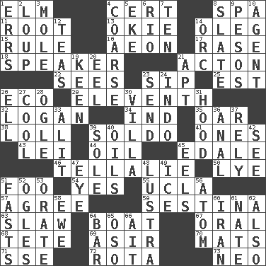 ACROSS 1. Shade tree 4. Sure thing 8. Health resort 11. Carrot, for example 13. Migrant worker of the '30s 14. Cassini of fashion 15. Court order 16. Period of immesurable duration 17. To erase 18. Orator 21. Gambison 22. Observes 23. Small drink 25. Eastern Standard Time (abbr.) 26. Environmental prefix 29. Veterans Day date 32. Utah city north of Ogden 34. Indiana (abbr.) 35. Rowing implement 38. Hang loosely or laxly 39. Twentieth part of a lira 41. Washington bills 43. Flowery wreath 44. Petroleum 45. Peak District village in England 46. Copy Pinocchio 50. Sodium hydroxide 51. Egg _ yung 54. Consenting reply 55. Southern CA. univ. 57. Match 59. French poetic form 63. Cole _ (cabbage dish) 64. Water vessel 67. Of the mouth 68. False hair 69. SW Saudi Arabia district 70. Floor protectors 71. Compass dir. 72. Roll call or roster of names 73. Modern: prefix DOWN 1. Blunders 2. Central Nebraska county 3. Undercover agent 4. Unrefined 5. Make supply last 6. River (Sp.) 7. Nine, plus one 8. Chalkboard 9. Mexican monetary units 10. Representative 12. Afternoon social gatherings 14. The grampus (Milton) 19. Peachy ____! 20. Snakelike fish 21. Fitting 23. Post 24. _ china 26. Pipe bend 27. Calm and collected 28. Stare 30. Country residence 31. Parka part 33. Came down and settled, as after flight 36. Of or related to the anus 37. Have confidence or faith in 39. Flatfish 40. Lubricates 42. Perceive with the eye 45. Snakelike fish 47. Sight organ 48. A period of five years 49. Frozen water 51. Goes without food and/or water 52. Stares at amorously 53. Declaim 56. Tiny particle 58. She-sheep 60. SW Asia republic 61. Nathan's nickname 62. In addition 64. Drinking establishment 65. Bear (Spanish) 66. Small island