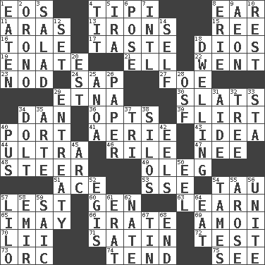 ACROSS 1. Greek goddess of the dawn 4. Native american tent (variation) 8. Hearing organ 11. Caspian sea tributary 13. Removes the wrinkles 15. To riddle 16. Lacquered or enameled metalware 17. Clothes sense 18. "Vaya con ____" 19. Related on the mother's side 21. Pipe bend 22. Left 23. Lower and raise head in agreement 24. Plant excrement 27. Enemy 29. Inactive volcano in Sicily 30. Narrow boards 34. One of the 12 tribes of Israel 36. Elects 39. Seductive woman who exploits men 40. Sweet dark-red dessert wine 41. Nest on high 43. The content of cognition 44. Extremist 46. Cause heat under the collar 47. Born 48. Guide 49. Cassini of fashion 51. Adept person 53. Compass dir. 54. The 19th letter of the Greek alphabet 57. For fear that 60. Commissioned military rank (abbr.) 63. Acquire or gain knowledge or skills 65. "If ____ say so..." 66. Feeling or showing extreme anger 69. Mine, in Marseilles 70. Cards in a Roman deck? 71. Smooth fabric 72. Trial 73. The grampus (Milton) 74. Watch over 75. Observe DOWN 1. Consumed 2. U. of Maine site 3. First course 4. Teat (slang) 5. Retirement account (abbr.) 6. Airs 7. International (abbr.) 8. 4th largest of the Great Lakes 9. A really long time 10. Relief 12. Put into a specified state 14. Oneself 18. Residence 20. Eastern Standard Time (abbr.) 25. Small Philippine buffalo 26. Some stationery 28. Order of Saint Francis (abbr.) 29. Plea 31. Helper 32. Relationship diagram 33. R.R. building 34. Dunce 35. Johnson of "Laugh-In" 37. Three (prefix) 38. Grain storage towers 40. Fluid product of inflammation 42. Snakelike fish 45. Curve 50. Snakelike fish 52. Armor plate that protects the chest 54. Softens 55. Came up 56. Join together 57. _ and Stitch 58. Independent ruler or chieftain 59. Ketch in the Levant 61. Part of Q.E.F. 62. Nathan's nickname 64. Erode 67. Shallow baking pan 68. Conclusion