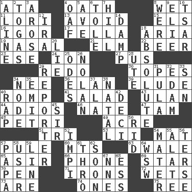 ACROSS 1. _ moment's notice (2 wds.) 4. Pledge 8. Dripping 11. Australian parrot (variant) 13. Keep away from 15. Raised railways 16. Russian composer Stravinsky 17. Man or boy (slang) 18. Operatic vocal solo 19. Relating to the nose 21. Shade tree 22. Fermented drink made from hops 23. Compass dir. 24. Electrically charged atom 27. Purulenc 29. Do over again 30. Drinks excessively 34. Born 36. Flair 39. Evade 40. Frolic 41. First course 43. ____ Bator, Mongolia 44. Goodbye (Sp.) 46. Nathan's nickname 47. Scottish cap 48. _ dish (used to culture cells) 49. 1/640 square mile 51. Three (prefix) 53. Cards in a Roman deck? 54. Floor protector 57. Whine 60. Mountains (abbr.) 63. A sleeping potion; an opiate (poet.) 65. SW Saudi Arabia district 66. Give a jingle 69. Play the lead 70. Animal enclosure 71. Removes the wrinkles 72. Soaks 73. "We ___ not amused" (Victoria) 74. Washington bills 75. Portuguese money of account (variant) DOWN 1. Place in a line 2. Ancient Roman robes 3. Came up 4. Clumsy lout 5. "___ Maria" 6. Lacquered or enameled metalware 7. Land elevation 8. Past tense of be (plural) 9. Writer Wiesel 10. Russian ruler of old 12. Retirement account (abbr.) 14. Moist 18. Utter; complete 20. Whopper 25. Lyric poems 26. Pitcher Ryan 28. Shoshoni 29. News announcer 31. Monetary unit of Botswana 32. Dutch treat 33. Elected rep. 34. Thickened enlargement 35. Send forth 37. Wing 38. Brizilian seaport 40. Hit sharply and swiftly 42. Tenth: prefix 45. Title for a knight 50. To free from 52. Body of Kaffir warriors 54. Mother 55. Having winglike extensions 56. Laconic 57. Dad 58. One who makes use of a thing 59. Actor's bit 61. Through, poetically 62. Within a short period 64. Compass dir. 67. Compass dir. 68. Curvy letter
