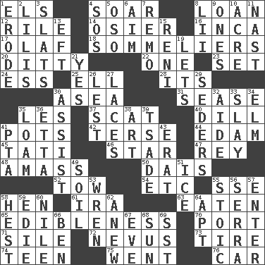 ACROSS 1. Raised railways 4. Fly high 8. Grant temporary use of 12. Cause heat under the collar 14. Flexible twig of a willow tree 16. South American Indian 17. Norwegian king 18. Wine waiters 20. Short, simple song 22. Single 23. Arrange properly for use 24. Double-curved letter 25. Pipe bend 28. It is 30. At sea 31. Gospel singer Marvin 35. French article 37. Go away! 40. Deli pickle 41. Cooking vessels 42. Laconic 44. Dutch treat 45. Jacques of French films 46. Play the lead 47. Marina Del _, California 48. Collect or gather 50. Raised platform 52. Pull behind 54. And so on (abbr.) 55. Compass dir. 58. Layer 61. Retirement account (abbr.) 63. Eroded 65. The property of being fit to eat 70. Sweet dark-red dessert wine 71. Filth; sediment 72. Mole, birthmark 73. Hoop that covers a wheel 74. Adolescent 75. Gone 76. Automobile DOWN 1. Wear away 2. Ms. Damita and namesakes 3. Narrow boards 4. Distress signal 5. Bear (Spanish) 6. Direct toward a target or goal 7. San ____ (Riviera town) 8. Cards in a Roman deck? 9. Washington bills 10. Measure of real estate 11. Political cartoonist Thomas 13. Newt 15. Painter Guido (1575-1642) 19. Allows 21. Affirmative reply 26. For fear that 27. Shoestrings 29. Spring feasts 30. Help 32. Assistant 33. Kill 34. Shade tree 35. Rich soil 36. Singer James 38. Nonscientific branch of learning 39. Sadhe (variant) 41. Parent Teacher Association (abbr.) 43. Part of Q.E.F. 49. Land 51. Frozen water 53. Songbird 55. Unemotional 56. Father Junipero _ 57. Keyboard key 58. Command 59. Singer Brickell 60. Mediterranean tributary 62. Afresh 64. Fitting 66. Benjamin's nick name 67. Night before a holiday 68. Player for Phoenix 69. Fast jet (abbr.)