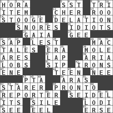 ACROSS 1. Israeli folk dance 5. Fast jet (abbr.) 8. Three (prefix) 11. A distinct part 12. "Mermaids" star 13. Friend of Pooh 14. Moe Howard, for one 17. Conveyance 19. Sounds asleep 21. Foolish or stupid persons 22. Greek goddess of the earth (variant) 23. Turn to the right 24. Plant excrement 27. For fear that 29. Big _ 32. Stories 34. Period 36. Undercover agent 37. Ancient Greek god of war 38. Pet locale 39. Roberta Peters solo 40. Tennis shots 41. Small drink 42. Metal shackles 43. Compass dir. 44. Adolescent 46. Born 47. Parent Teacher Association (abbr.) 50. Caspian sea tributary 52. A viewer who gazes fixedly 55. Right away 57. News announcer 59. Beer mug 62. ___ a Wonderful Life 63. Drop; flow; fall 64. Farming town in central California 65. Perceive with the eye 66. Snakelike fish 67. Celtic language DOWN 1. Part of HMS, perhaps 2. Baseball player Mel 3. Vintage cars 4. Amid 5. A female animal or person 6. Major League Baseball Commissioner Bud 7. Exchange 8. Musical group of three 9. Carrot, for example 10. Charged atoms 12. Music discs 15. Scores awarded for successful feats 16. 4th largest of the Great Lakes 18. Make a knot 20. Artist's stands 24. Lacking originality or spontaneity 25. Composer Copland 26. Military trainee 28. Distinguishing feature 29. Person of subnormal intelligence 30. Place in a line 31. Stop 33. Double-curved letter 35. Become visible 36. Spoil 42. Empty; void 45. Greek god of love 47. Adept person 48. Laconic 49. Nick name for Arthur 51. Vertical member of a panel or frame 52. Indian titles of respect 53. False hair 54. Domed church section 55. Before (prefix) 56. Aroma 58. Pipe bend 60. Begley and Asner 61. Untruth