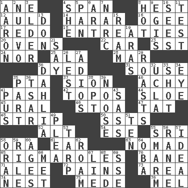 ACROSS 1. One (Scot) 4. Connect, as a bridge 8. Behest 12. Old (Scot.) 14. Ethiopian city, capital of Harari 16. Double curve, resembling the letter S 17. Do over again 18. Pleas 20. Baking chambers 22. Auto 23. Fast jet (abbr.) 24. Not either 25. Wing 28. Make imperfect 30. Colored 31. Lush 35. Parent Teacher Association (abbr.) 37. The Jewish people; Israel 40. Painful 41. Romantic infatuation 42. Traditional theme or motif 44. _ gin 45. Mountain range 46. Portico 47. Make lace 48. Empty completely 50. Fast planes 52. Keyboard modifier key 54. Compass dir. 55. Indian title of respect (Mr.) 58. Mouth or opening 61. Ewer handle 63. Roamer 65. Frustrating wastes of time 70. Object of repulsion 71. Toward shelter 72. Aches 73. Type of rug 74. A home for chicks 75. Ancient Persian 76. Cartoonist voice _ Blanc DOWN 1. Composer Copland 2. New (sp.) 3. A person who is older than you are 4. A female animal or person 5. Baking dish 6. Tate display 7. Drug cop 8. Being at a high temperature 9. The front part of a cuirass 10. Observes 11. Trial 13. Spanish title 15. 480, 500 or 516 sheets of paper 19. Caspian sea tributary 21. Declare 26. For fear that 27. Goodbye (Sp.) 29. Ridicules or criticizes harshly 30. Mexican or Central American flower 32. Southern CA. univ. 33. Attempt 34. Sight organ 35. Role in a play 36. Russian ruler of old 38. Choose 39. Trap for birds or small mammals 41. Purulenc 43. Backtalk 49. Entreaty 51. "___ Little Indians" 53. Canvas cover 55. Excessive but superficial compliments 56. Indian princess (variant) 57. Perfect 58. NW Algerian seaport 59. Cause heat under the collar 60. Eras 62. Wander 64. Chief or king in Benin or Nigeria 66. Was introduced to 67. Whopper 68. Conclude 69. Compass dir.