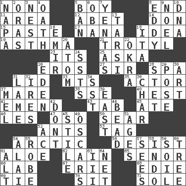 ACROSS 1. Words to Nanette 5. Male child 8. Conclude 11. Type of rug 12. Collude with 14. Spanish title 15. Thick mixture 17. Nanny 18. It may be bright or harebrained 19. Respiratory problem 21. TNT 23. It is 25. "____ silly question..." 26. Greek god of love 27. Title for a knight 28. Health resort 31. Flaplike covering 33. Mountains (abbr.) 35. Thespian 37. Female horse 38. Compass dir. 40. Behest 41. Make improvements or corrections to 43. Bar bill 45. Had dinner 46. French article 47. Bear (Spanish) 50. Dry up 52. Pismires 53. Label 54. Northern region 56. Cease 61. Medicinal plant 62. (Had) reclined 65. Sir (Sp.) 66. Experiment locale 67. One of the Great Lakes 68. Singer Brickell 69. Standoff 70. Be seated 71. Not divided or shared with others DOWN 1. California wine valley 2. Mouths or openings 3. A home for chicks 4. Pledge 5. Bar 6. Chief or king in Benin or Nigeria 7. Gossips 8. Whirlpool 9. Christmas carol 10. Heredity factor (abbr.) 13. Tarsus (plural) 16. Arab leader 18. Call ___ day 20. Tiny particle 22. Gumbo ingredient 24. Fast planes 26. Locale of original sin 28. Proofreading order 29. Introduce or present, as a question 30. Tate display 31. Unable to walk 32. Angers 34. Fast jet (abbr.) 36. Burn to charcoal 37. Cartoonist voice _ Blanc 39. 90 degrees 42. Do not 44. Necklace unit 48. Vertical member of a panel or frame 49. Motion picture awards 51. Grows older 52. Adept person 54. Mountain range southwest of Kyrgyzstan 55. Loose flowing garment 57. Observes 58. Southeast Asian peninsula 59. Earth 60. Relationship diagram 61. The first octave above the treble staff 63. One more than two 64. Fish or hair follower