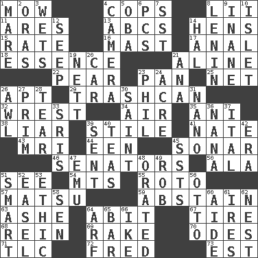 ACROSS 1. Cut the grass 4. 911 reaches them 8. Cards in a Roman deck? 11. Ancient Greek god of war 13. Lettered men learn these first 14. Coop moms 15. Pace 16. Vertical spar for supporting sails 17. Of or related to the anus 18. Core 21. Place in a line 22. Lightbulb-shaped fruit 23. Baking dish 25. Fish or hair follower 26. Fitting 29. File 13 32. Obtain by seizing forcibly or violently 34. Wind 35. Black tropical American cuckoo 38. One who doesn't tell the truth 39. Vertical member of a panel or frame 41. Nathan's nickname 43. Medical imaging device (abbr.) 44. Car or cant ending 45. Echolocation 46. Elected representatives 50. According to 51. Observe 54. Mountains (abbr.) 55. Printing process, for short 57. Taiwanese island in East China Sea 59. Refrain by choice 63. American tennis player Robert 64. "This won't hurt ____!" 67. Hoop that covers a wheel 68. It's straight from the horse's mouth 69. Libertine 70. Lyric poems 71. Affectionate concern, for short 72. Flintstone 73. Eastern Standard Time (abbr.) DOWN 1. Female horse 2. Mouths or openings 3. Soaks 4. Device for capturing images 5. Chief or king in Benin or Nigeria 6. Personal Computers (abbr.) 7. Fast jet (abbr.) 8. Soviet premier 1918-24 9. Empty; void 10. Small island 12. Ooze 14. Actor Linden 19. Remaining after all deductions 20. 4-wheeled motor vehicle 21. Santa ___, CA 23. Silvers or Donahue 24. 43,560 square feet 26. Leather borer 27. Demure 28. Rend 30. Virtuous person 31. Billionth: prefix 33. Indian titles of respect 36. Grandmother 37. Slanted text style (abbr.) 39. Emitted 40. Beverages made from leaves 42. Period 45. Fast planes 47. Australian flightless bird 48. Declaimed 49. Director Reiner 51. Don Adams' spy role 52. Artist's stand 53. Moral principle 56. Von Bismarck 58. Elected rep. 60. Assistant 61. Angers 62. A home for chicks 64. Sandy's bark 65. Drinking establishment 66. D.D.E's nickname