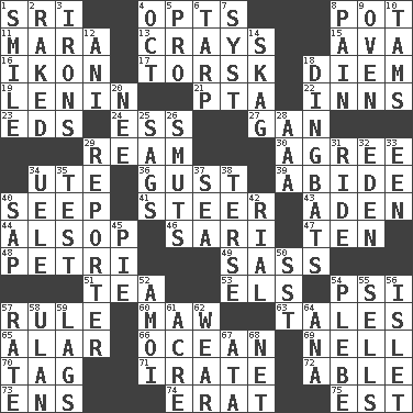 ACROSS 1. _ Lanka 4. Elects 8. Cooking vessel 11. Hindu Mythology: god of death 13. Trading vessels 15. Actress Gardner 16. Picture 17. Cod relative 18. South Vietnam president (1954) 19. Soviet premier 1918-24 21. Parent Teacher Assoc. 22. Restaurants 23. Begley and Asner 24. Curvy letter 27. Separate the seeds from cotton 29. 480, 500 or 516 sheets of paper 30. Match 34. Shoshoni 36. Abrupt rush of wind 39. Stay 40. Ooze 41. Bull 43. An important port of Yemen 44. Columnist Joseph or Stewart 46. Indian skirt 47. Nine, plus one 48. _ dish (used to culture cells) 49. Backtalk 51. Afternoon social gathering 53. Raised railways 54. Air pressure measure (abbr.) 57. General guideline 60. Informal term for the mouth 63. Stories 65. Having or resembling wings 66. Sea 69. 1994 drama film starring Jodie Foster 70. Label 71. Feeling or showing extreme anger 72. Competent 73. Followers of ems 74. Part of Q.E.F. 75. Eastern Standard Time (abbr.) DOWN 1. Grin 2. Moved through 3. Removes the wrinkles 4. Sep. follower 5. Adept person 6. Canvas cover 7. System (abbr.) 8. Ache 9. Baking chamber 10. Scottish caps 12. Cuckoo 14. Heroin 18. Empty-headed or silly people 20. Born 25. Sinks 26. Particles of soot 28. Auto club (abbr.) 29. Newsperson 31. Travel on or in a vehicle 32. Genesis locale 33. Car or cant ending 34. Ubangi River tributary 35. Trial 37. Ocean 38. Laconic 40. Plant excrement 42. Monetary unit of Yemen 45. Sliced dessert 50. Fast jet (abbr.) 52. Mine, in Marseilles 54. Military trainee 55. Exchanges for money 56. Small island 57. Assign a rank or rating to 58. Uhlan (variant) 59. Straggles 61. 43,560 square feet 62. Put on (as clothing) 64. Santa ___, CA 67. _ moment's notice (2 wds.) 68. Fish or hair follower