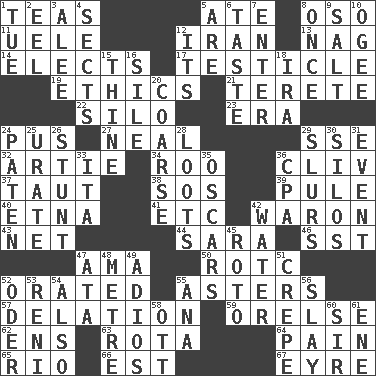 ACROSS 1. Afternoon social gatherings 5. Had dinner 8. Bear (Spanish) 11. Ubangi River tributary 12. SW Asia republic 13. Tired old horse 14. Opts 17. A testis 19. Value system 21. Cylindrical with tapered ends 22. Grain storage tower 23. Period 24. Ichor 27. Actress Patricia 29. Compass dir. 32. Nick name for Arthur 34. Friend of Pooh 36. 154 in Roman numerals 37. Tense 38. Mayday 39. Whimper 40. Inactive volcano in Sicily 41. And so on (abbr.) 42. Make _____ (do battle with) 43. Fish or hair follower 44. "Two Mules for Sister ____" 46. Fast jet (abbr.) 47. Nursemaid (var.) 50. College mil. group 52. Spoke pompously 55. Michaelmas daisies 57. Conveyance 59. Threatening words 62. Followers of ems 63. Round or rotation of duties 64. Ache 65. River (Sp.) 66. Eastern Standard Time (abbr.) 67. Jane of fiction DOWN 1. Third day of the wk. 2. Snakelike fish 3. Toward shelter 4. Religious groups 5. "We ___ not amused" (Victoria) 6. Clothes sense 7. Keyboard key 8. At one time in the past 9. Table seasoning 10. Double curve, resembling the letter S 12. ___ a Wonderful Life 15. One or ones belonging to thee 16. Drop; flow; fall 18. Retirement account (abbr.) 20. Unrefined 24. Eucharist need 25. A salt of uric acid 26. Check the growth or development of 28. Plunders 29. Runs notes together 30. Grain storage towers 31. Incident 33. Call ___ day 35. Motion picture awards 36. Tax preparer (abbr.) 42. Wetness 45. Printing process, for short 47. "One Day ___ Time" 48. Distance measurement (Brit.) 49. Goodbye (Sp.) 51. Streamer paper 52. River in Europe 53. Painter Guido (1575-1642) 54. In addition 55. Santa ___, CA 56. Kill 58. Baseball player Mel 60. Title for a knight 61. Compass dir.